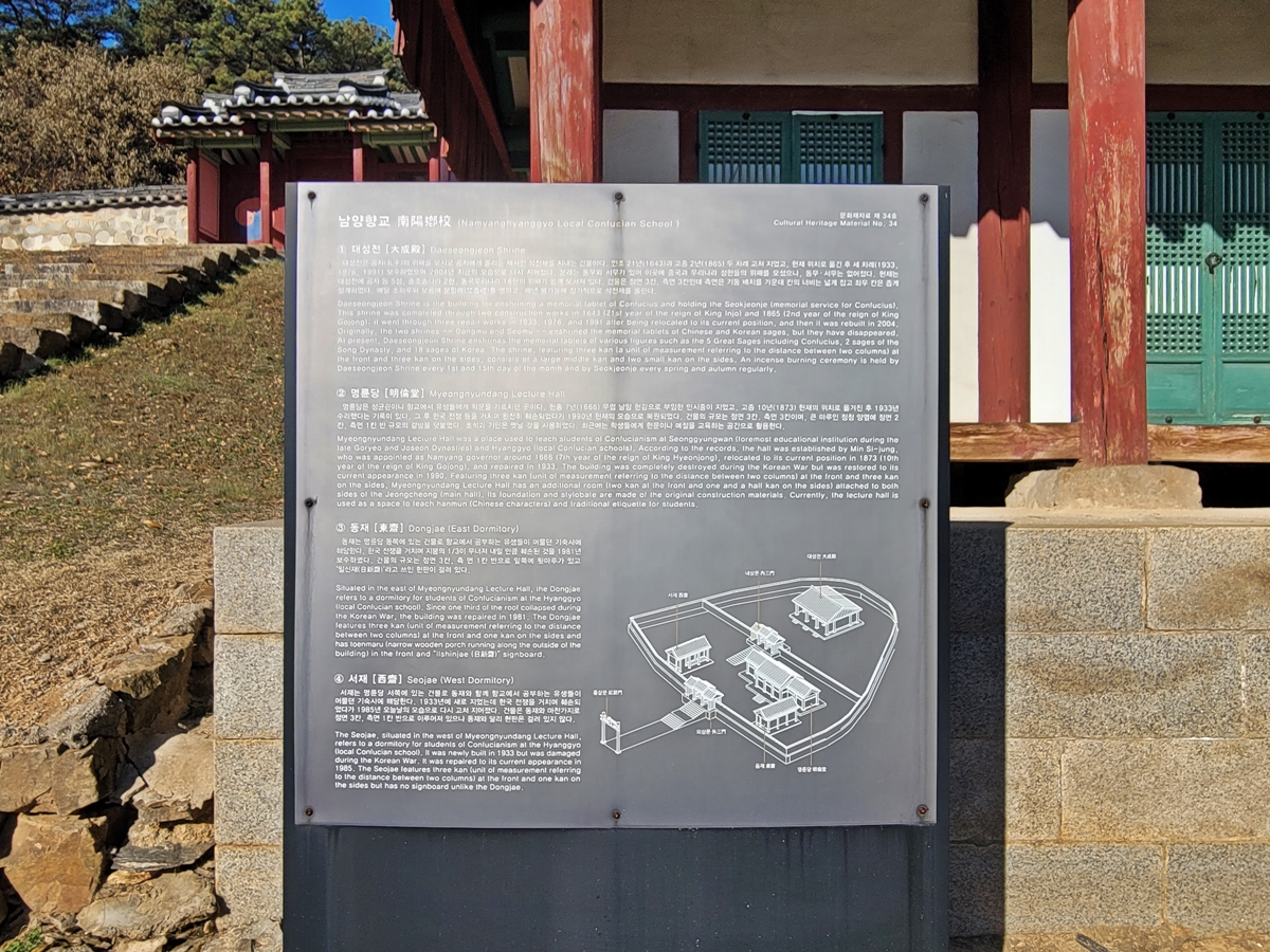 외삼문으로 들어가면 명륜당(明倫堂)이 나옵니다. 명륜당 좌측 아래 안내판이 있는데요, 읽어보니 향교에서 유생들에게 학문을 가르치던 곳이라고 설명돼 있습니다. 그리고 한국전쟁 중에 완전히 훼손되었다가 1990년 현재의 모습으로 복원되었다는 내용도 적혀 있네요. 고려말부터 이곳에서 수많은 유생이 ‘공자 왈, 맹자 왈~’ 하며 공부했을 겁니다. 지금도 유생들이 공부하는 목소리가 들리는 듯합니다.