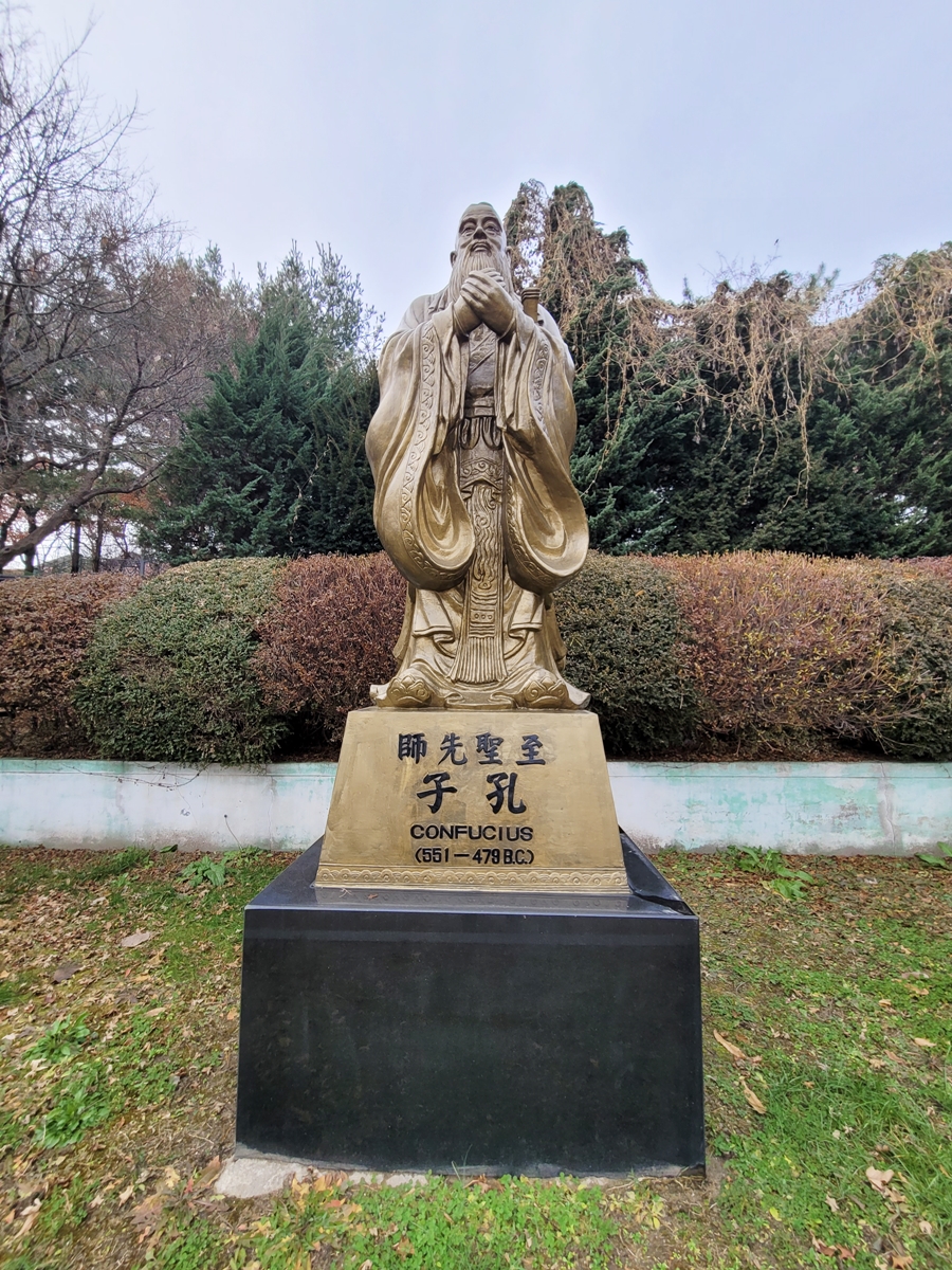 향교 안으로 들어서니 명륜당 왼쪽에 공자(孔子)의 동상이 있습니다. 왜 이곳에 공자의 동상이 있을까요? 동상 오른쪽에 안내석이 있습니다. 중국 산둥성 제남시가 수원시의 자매도시 체결 10주년을 기념하고 양 시의 우호증진을 위해 공자 동상을 기증한 것입니다.