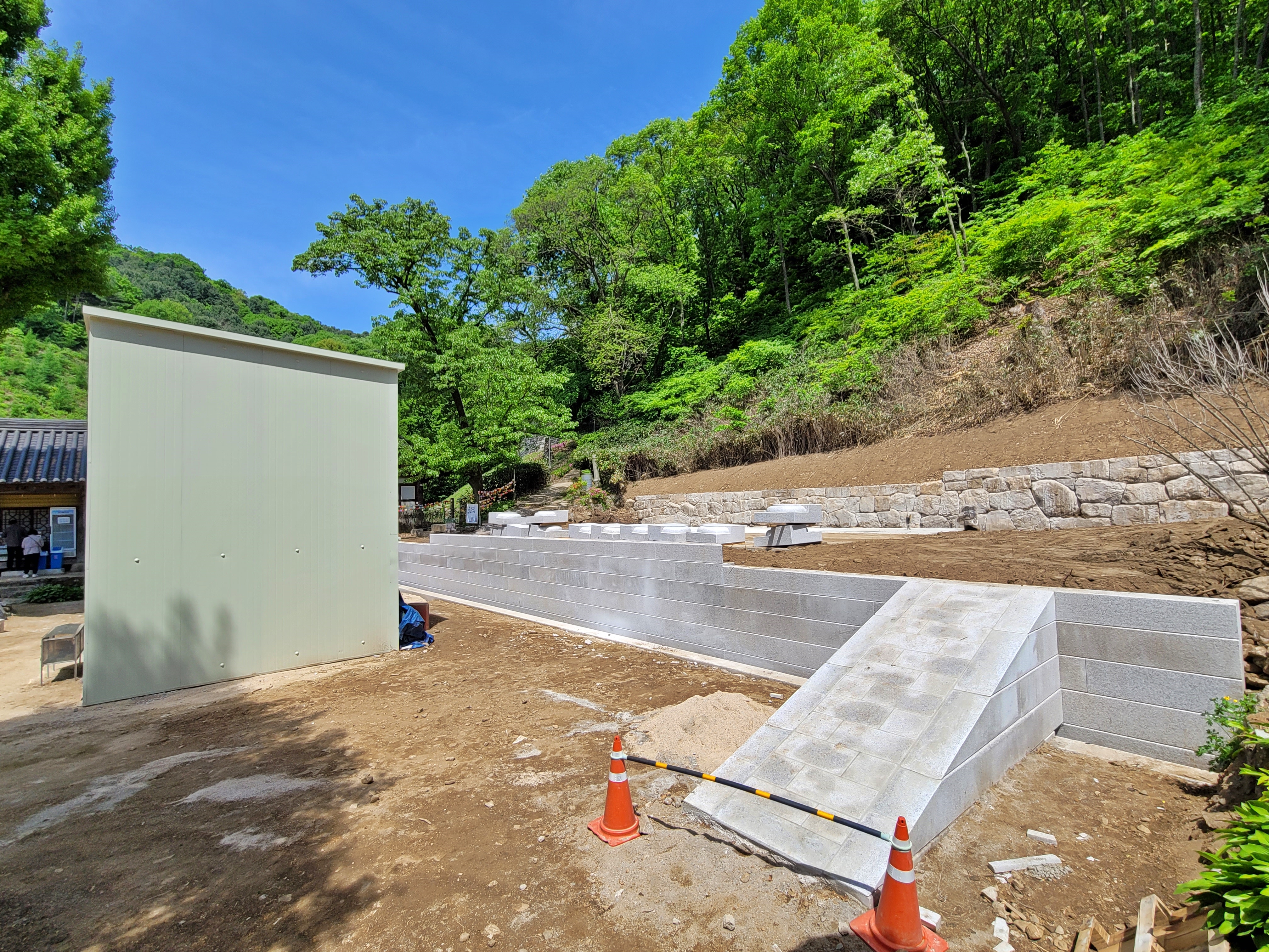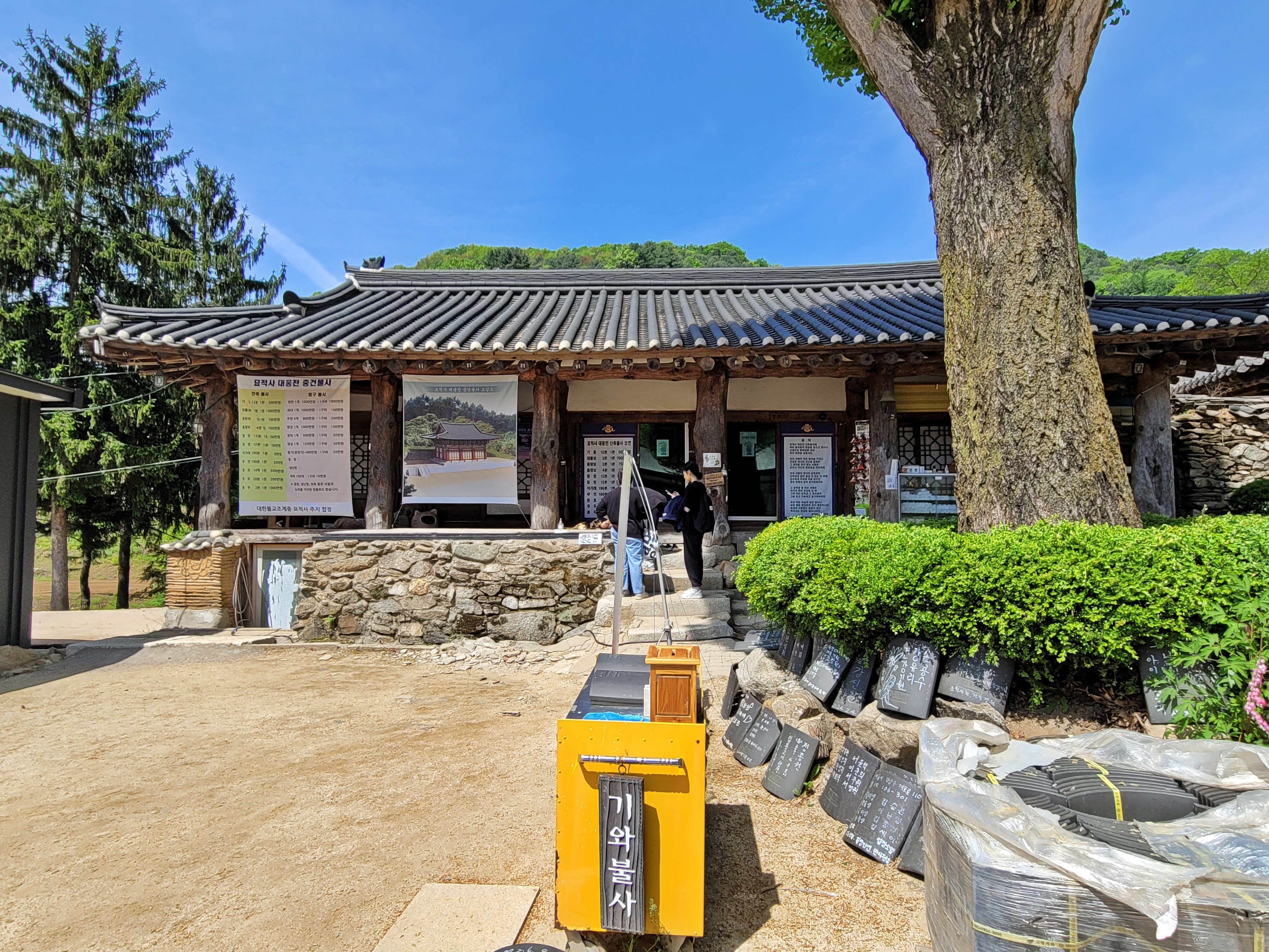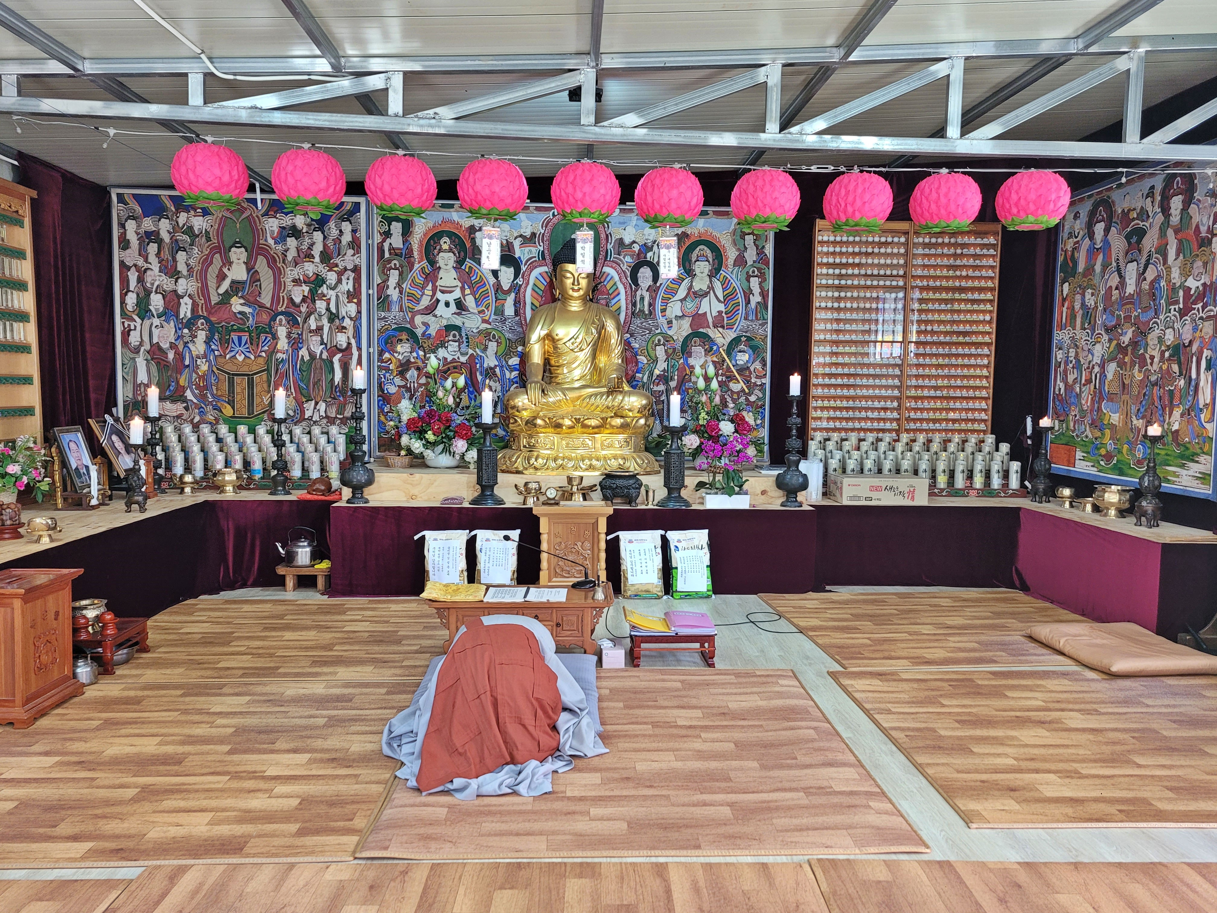 대웅전을 새로 짓고 있어서 경내 좌측에 임시 대웅전을 만들었습니다. 안을 보니 스님 한 분이 목탁을 두드리며 신자들 없이 법회를 하고 있었습니다. 종무소에서 대웅전 신축에 따른 불사를 받고 있는데요, 대웅전이 완공되면 어떤 모습일까요?