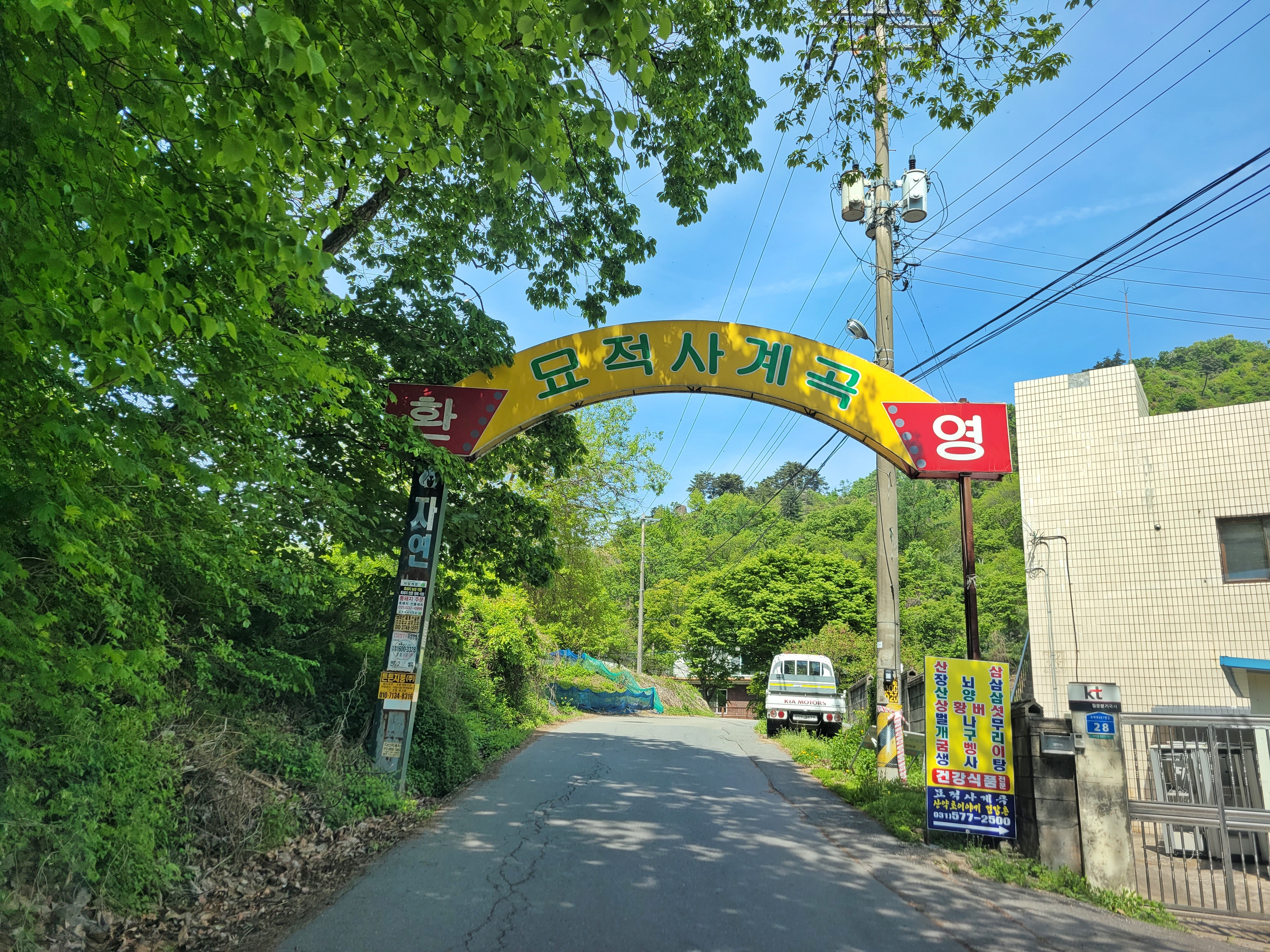 묘적사는 여름 피서지로 유명한 묘적사 계곡 상류에 있습니다. 묘적사 계곡 입구에 환영하는 아치형 입간판이 있는데요, 이곳을 지나 꼬불꼬불한 길을 한참을 가야 합니다. 묘적사까지 가는 길이 좁아서 교행이 힘든 곳도 있어서 조심해서 가야 합니다.