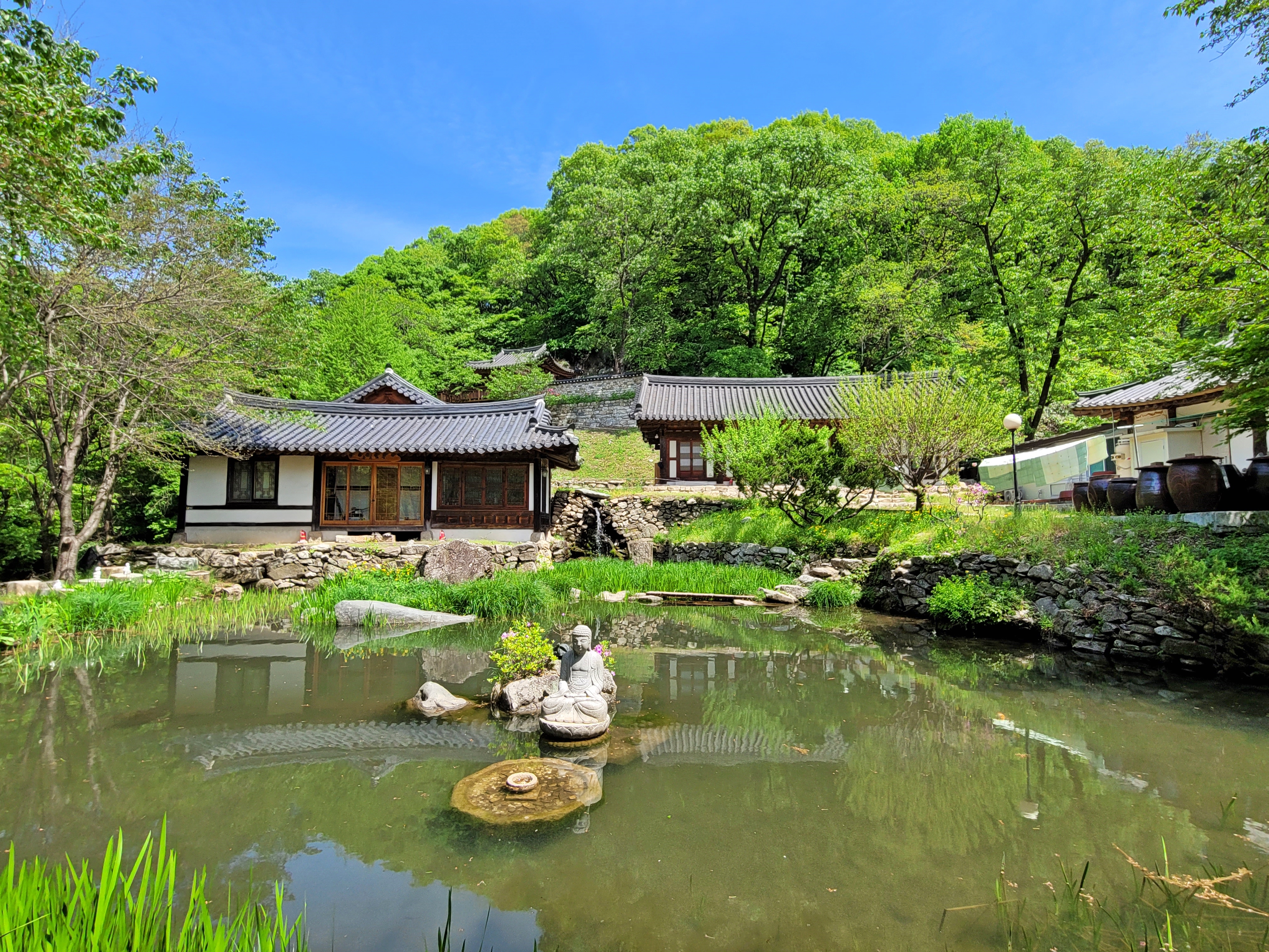 묘적사에서 풍경이 가장 좋은 곳은 템플스테이관 앞 연못입니다. 연못 한 가운데 부처님이 계시고, 그 뒤로 앞서 소개했던 산령각과 석굴암이 보입니다. 3년 전에 갔을 때는 이곳에 유명 연예인이 템플스테이하는 사진이 있었는데, 이번에 가보니 없네요.