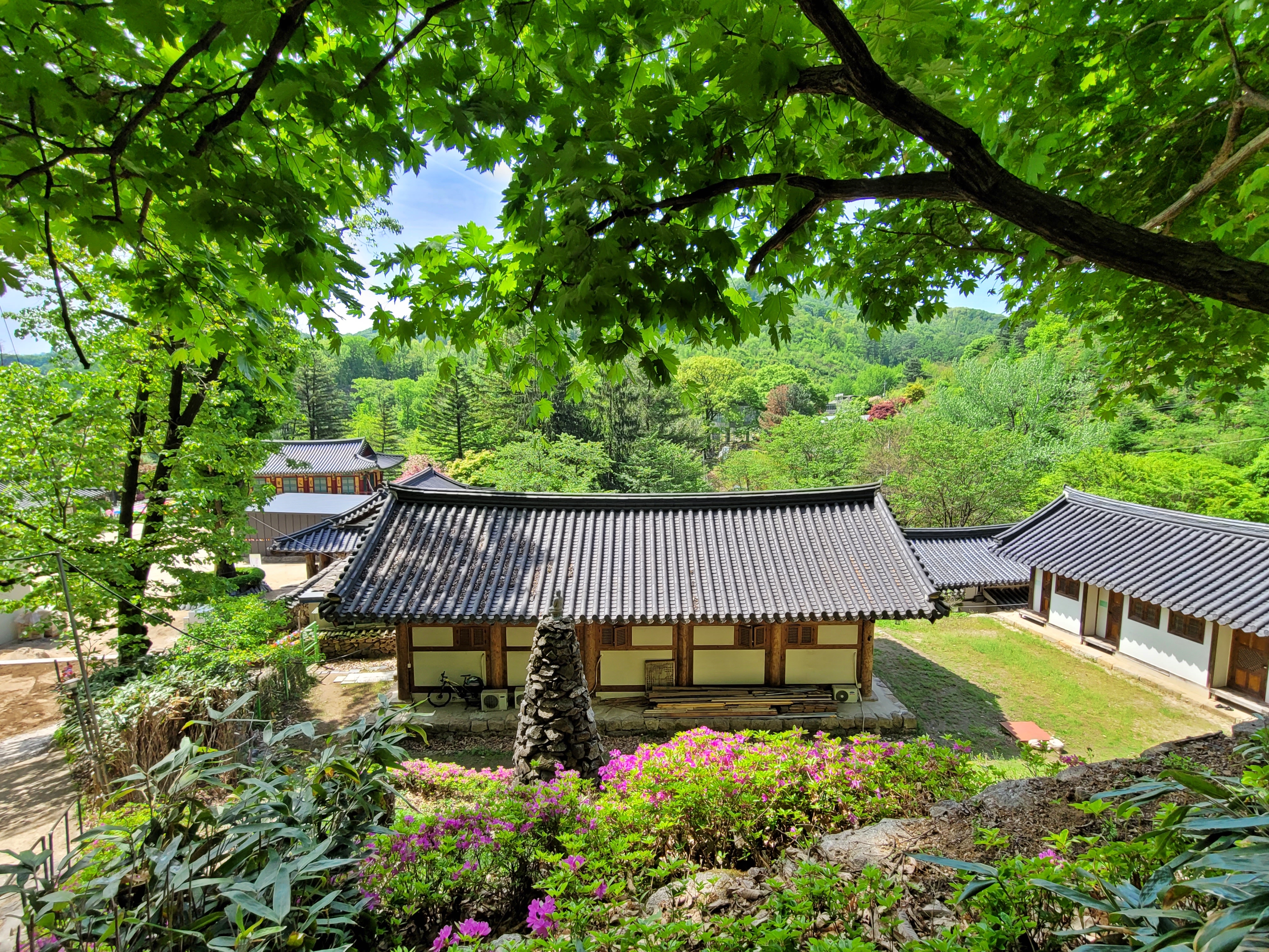 산령각에서 내려오다 묘적사 전경을 봤습니다. 향운전(템플스테이관)과 무영루 등이 보이는데요, 신록에 둘러싸인 사찰 풍경이 한 폭의 그림처럼 아름답습니다. 불자가 아니더라도 이런 풍경만 봐도 저절로 힐링되는 듯합니다.