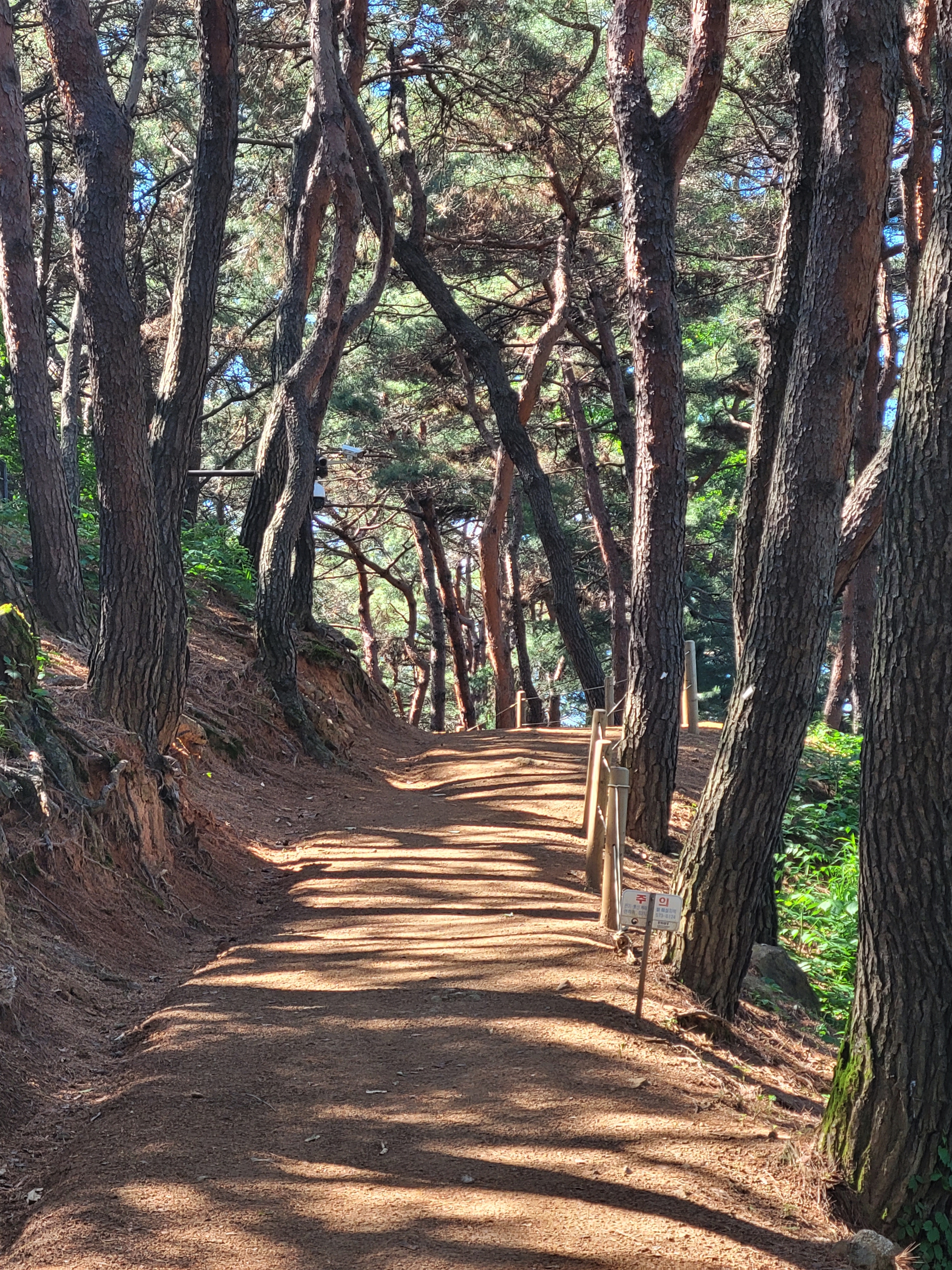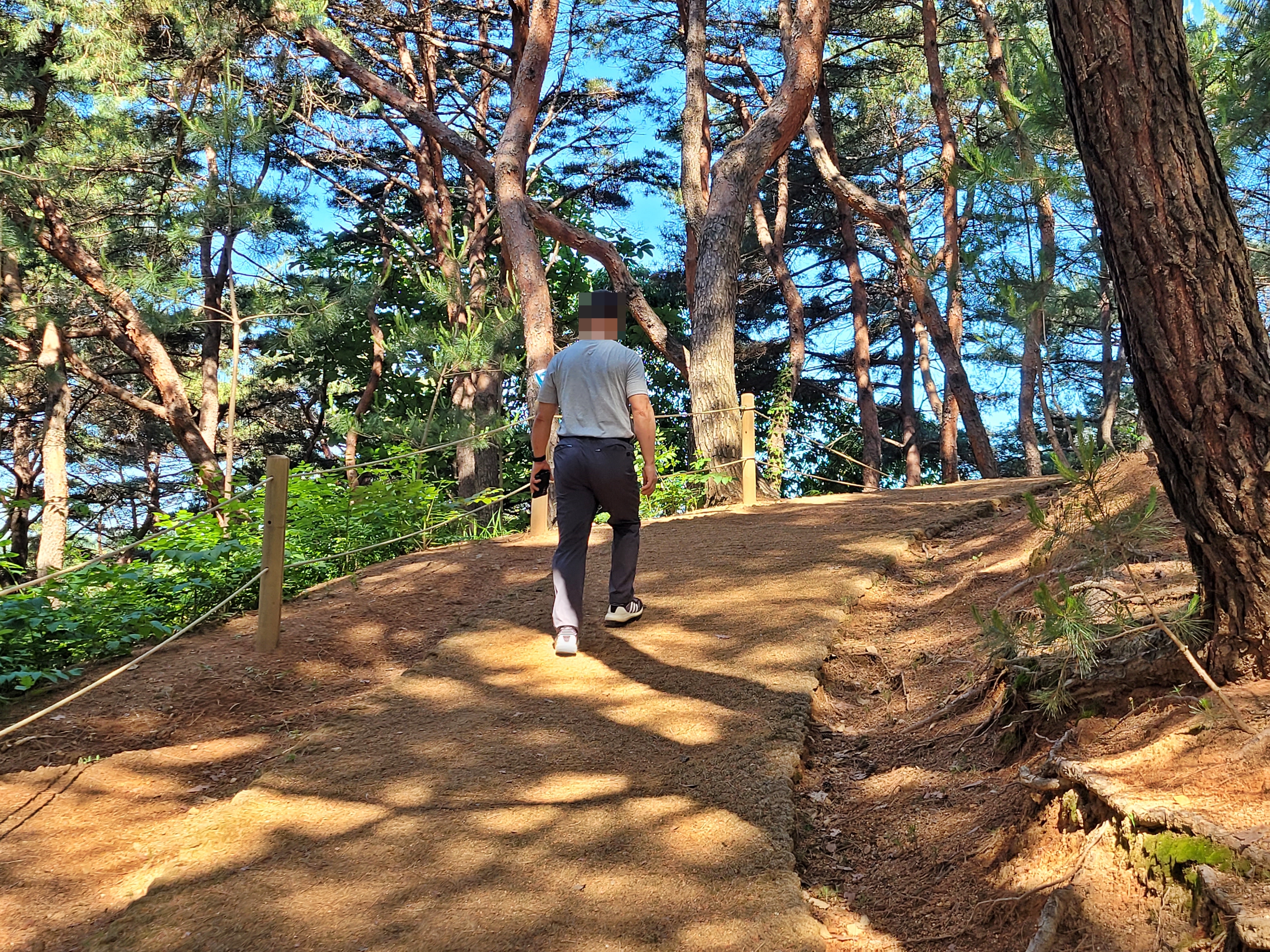 숲길 중간에 이렇게 나무로 만든 데크가 있습니다. 이렇게 좋은 곳이 또 있을까요? 여기서 소나무 숲을 바라보며 잠시 쉬어갑니다.