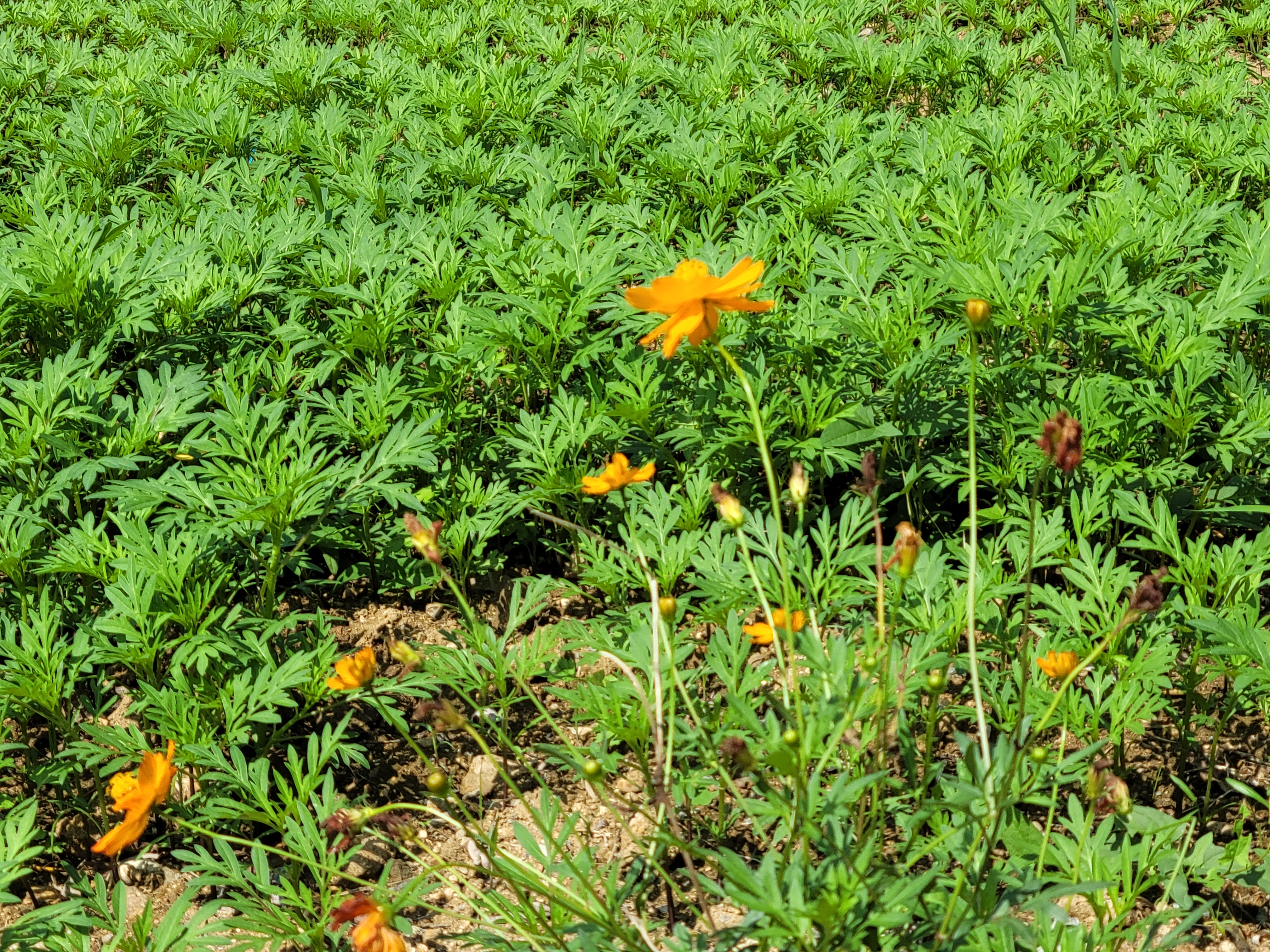물의정원은 6월에 양귀비꽃이 화려하게 피었는데요, 마음정원의 가을은 어떤 꽃이 필까요? 산책로 옆으로 꽃씨 파종 구간이 있는데 무슨 꽃인지 몰라 아내에게 물었더니 황화 코스모스라고 합니다. 성질 급한 일부 꽃은 벌써 피었더라고요.