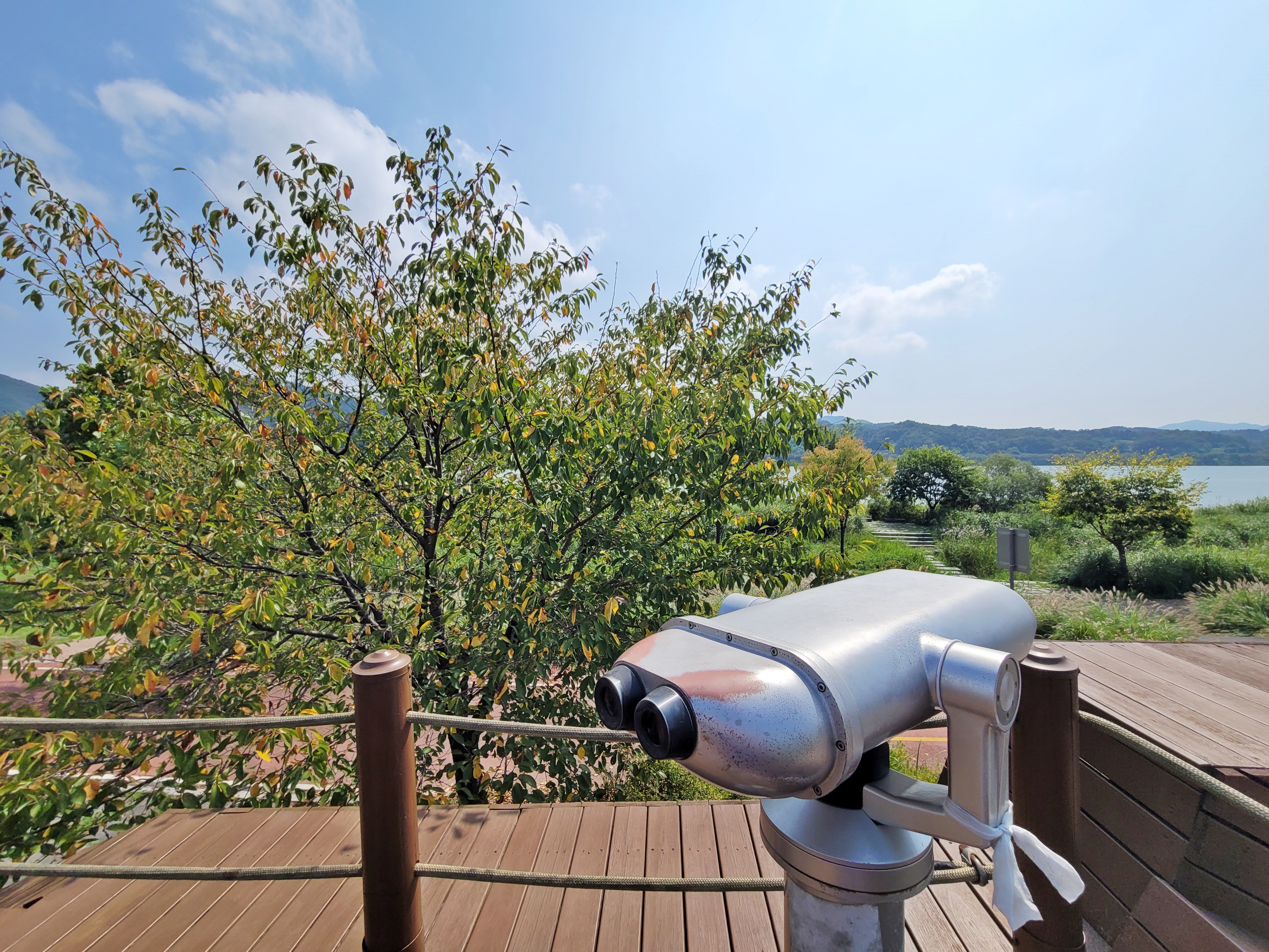 황포 돛단배에는 망원경이 있는데요, 저 멀리 북한강 건너 양평까지 보입니다. 그리고 나무들을 보니 누렇게 변하고 있는데요, 가을이 성큼성큼 다가옴을 느낍니다.