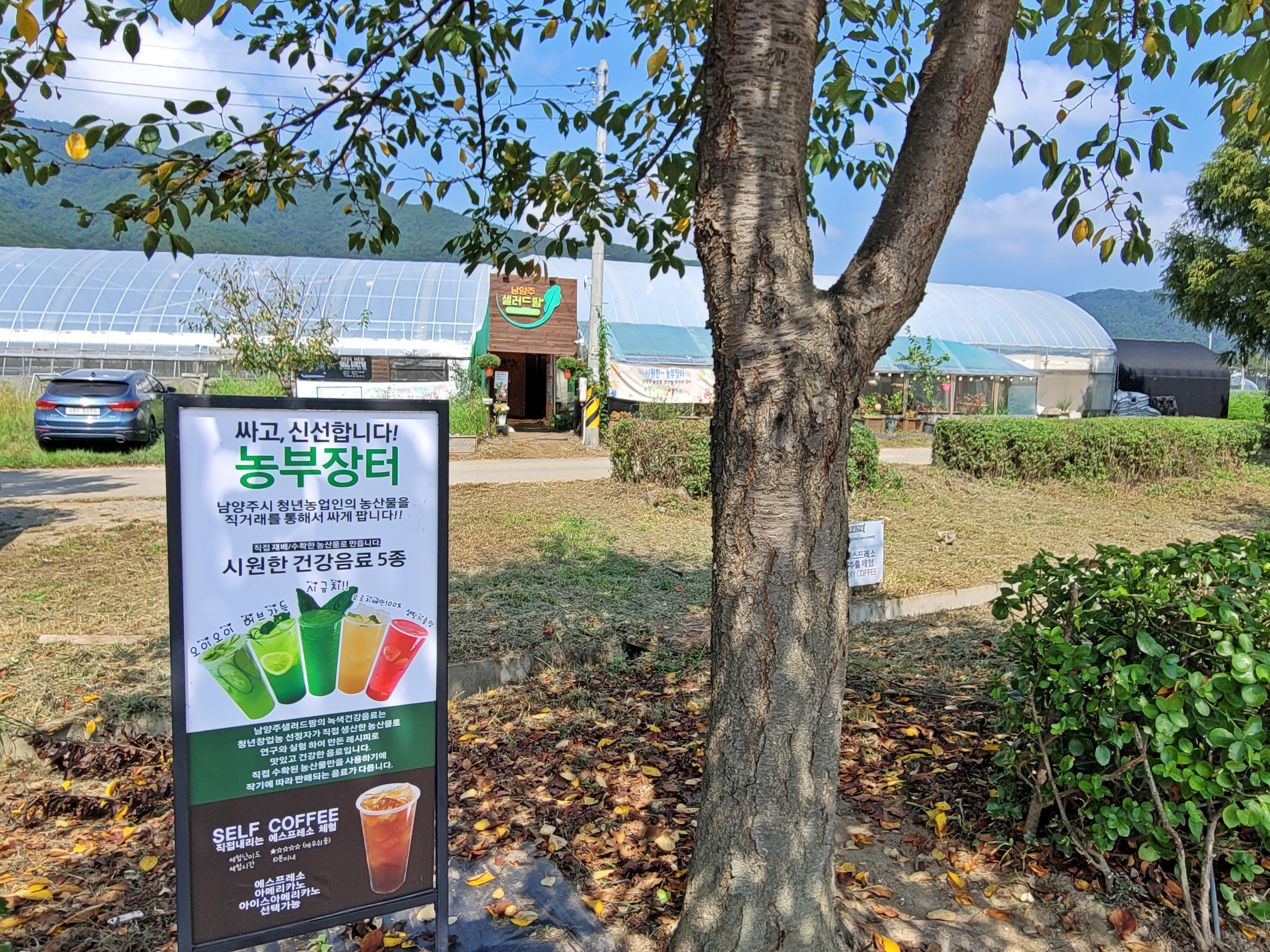 물의정원 거의 다 왔을 무렵에 농부장터가 보였습니다. 이곳은 남양주시 청년 농업인의 농산물을 직거래로 싸게 파는 곳입니다. 농산물뿐만 아니라 오이, 허브, 시금치, 오렌지, 생딸기 등 건강 주스도 판매합니다.