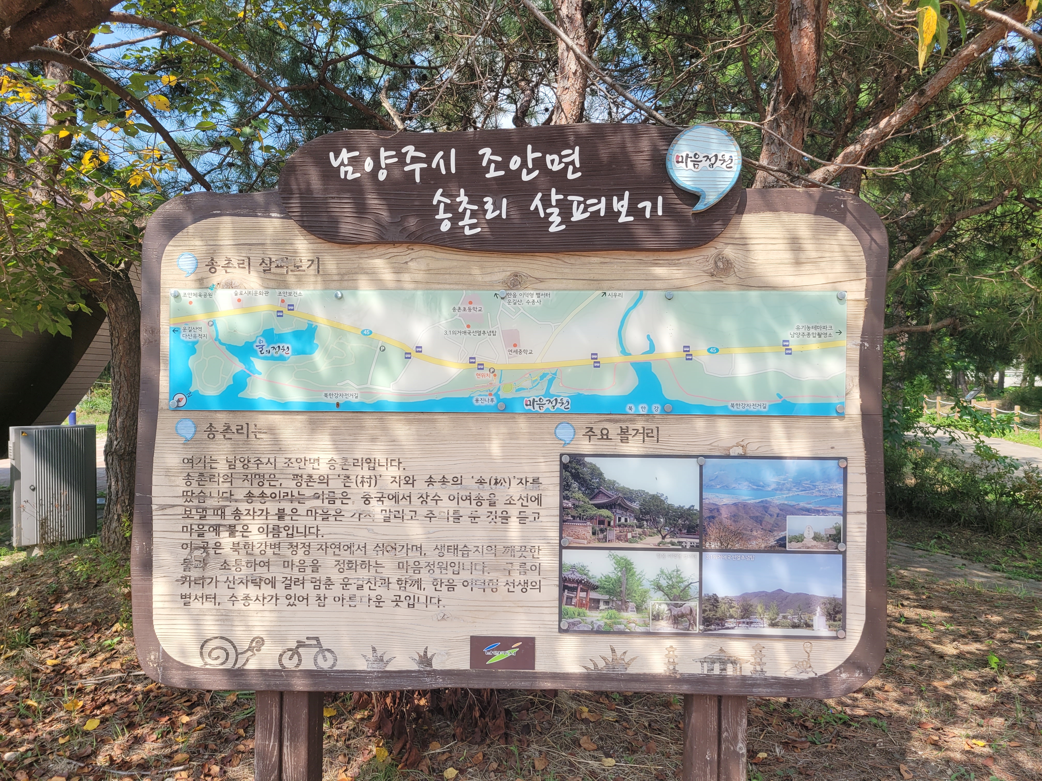 마음정원이 있는 조안면 송촌리는 슬로시티입니다. 왜 마음공원이 아니라 마음정원일까요? 안내판을 보니 북한강 변 청정 자연에서 쉬어가며, 생태습지의 깨끗한 물과 소통하며 마음을 정화하는 의미에서 마음정원이라고 합니다.