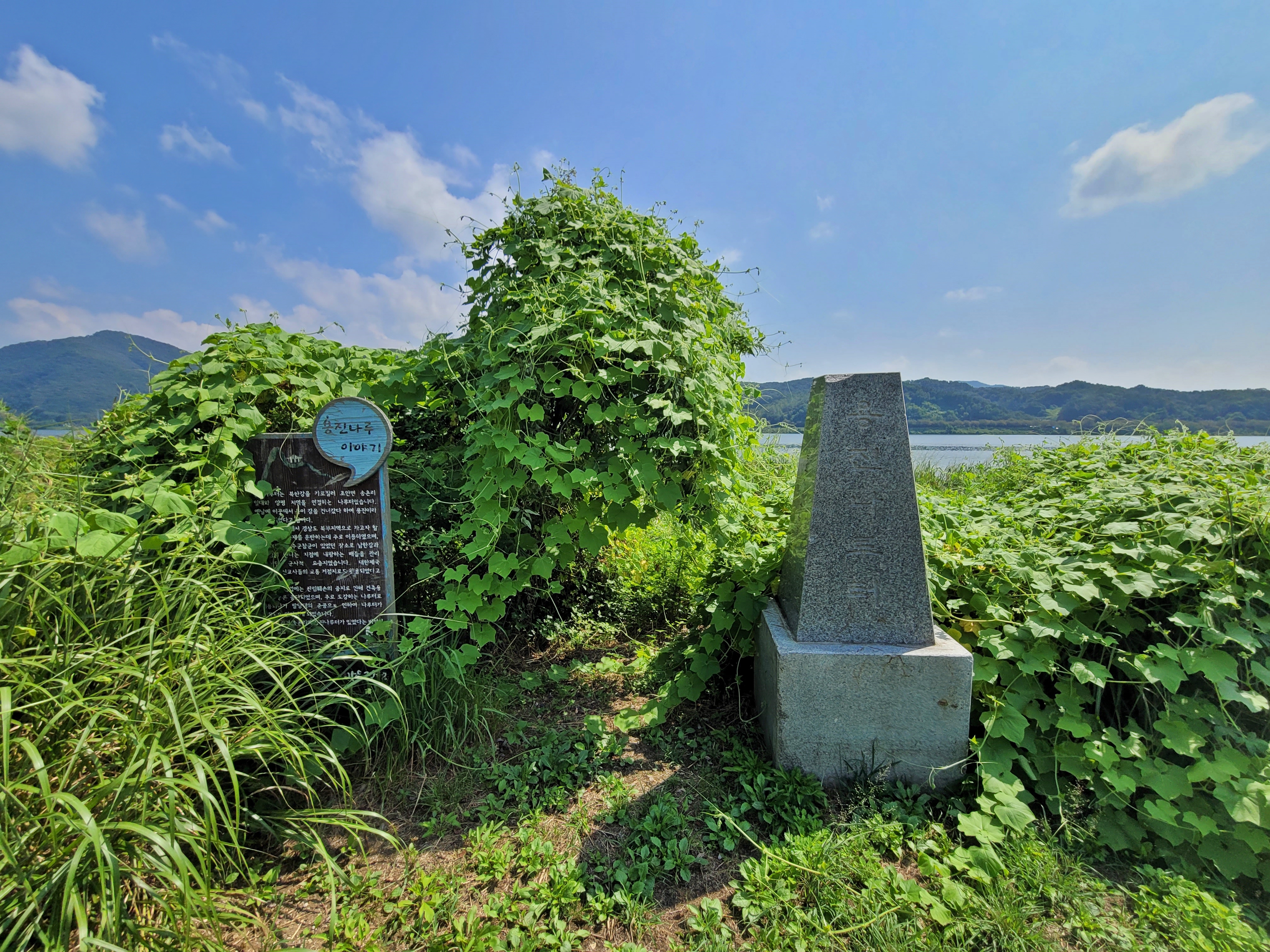 물의정원 강변산책길에서 다시 마음정원으로 발길을 돌렸습니다. 황포 돛단배 앞 주차장에 차를 세워 놓아서요. 돛단배가 있는 곳으로 와보니 용진 나루터 이야기가 있습니다. 이곳이 옛날에 용진 나루터였습니다. 유래를 보니 옛날에 용이 이 강을 건넜다고 해서 용진이라고 불렸다고 합니다.