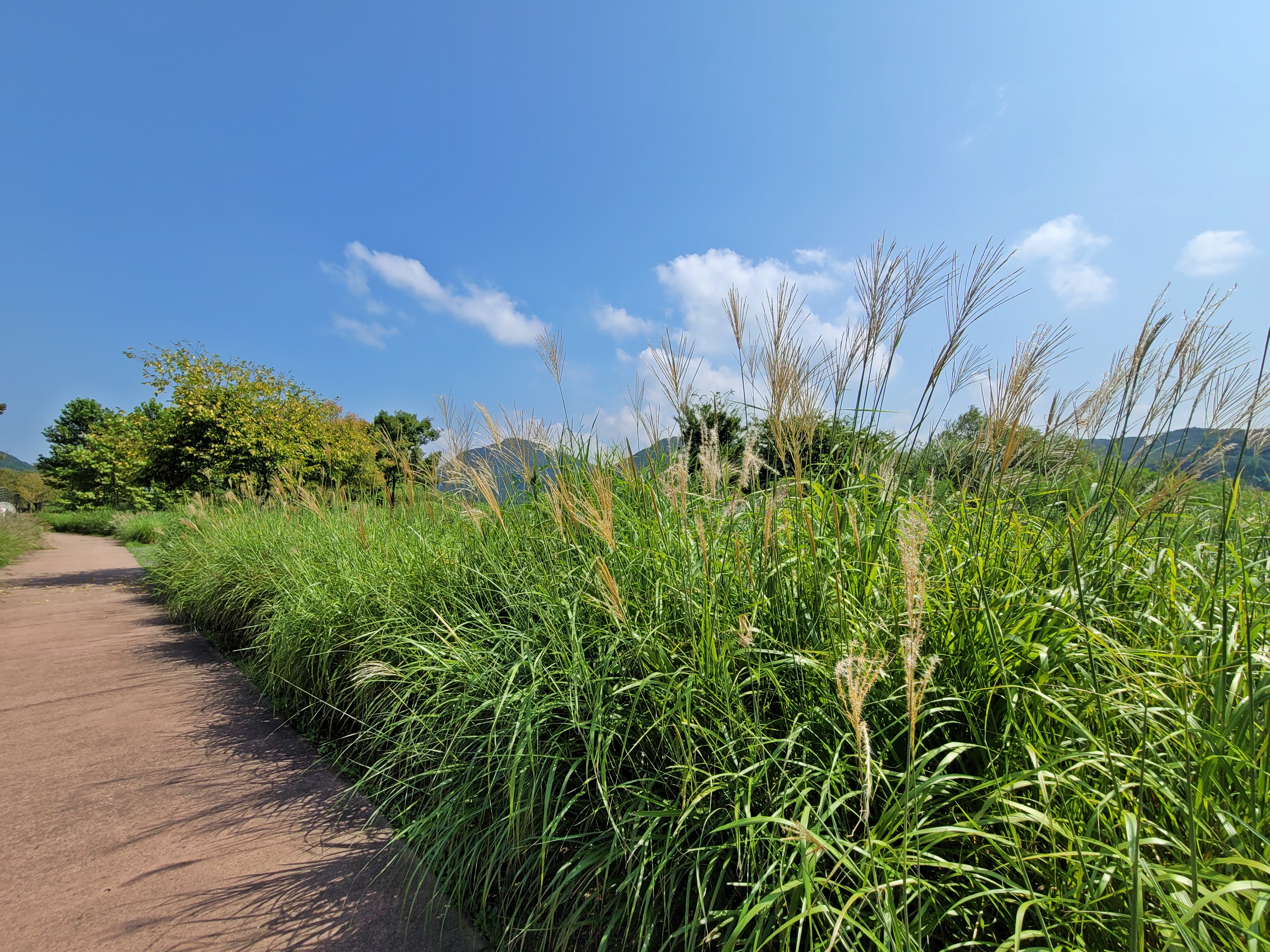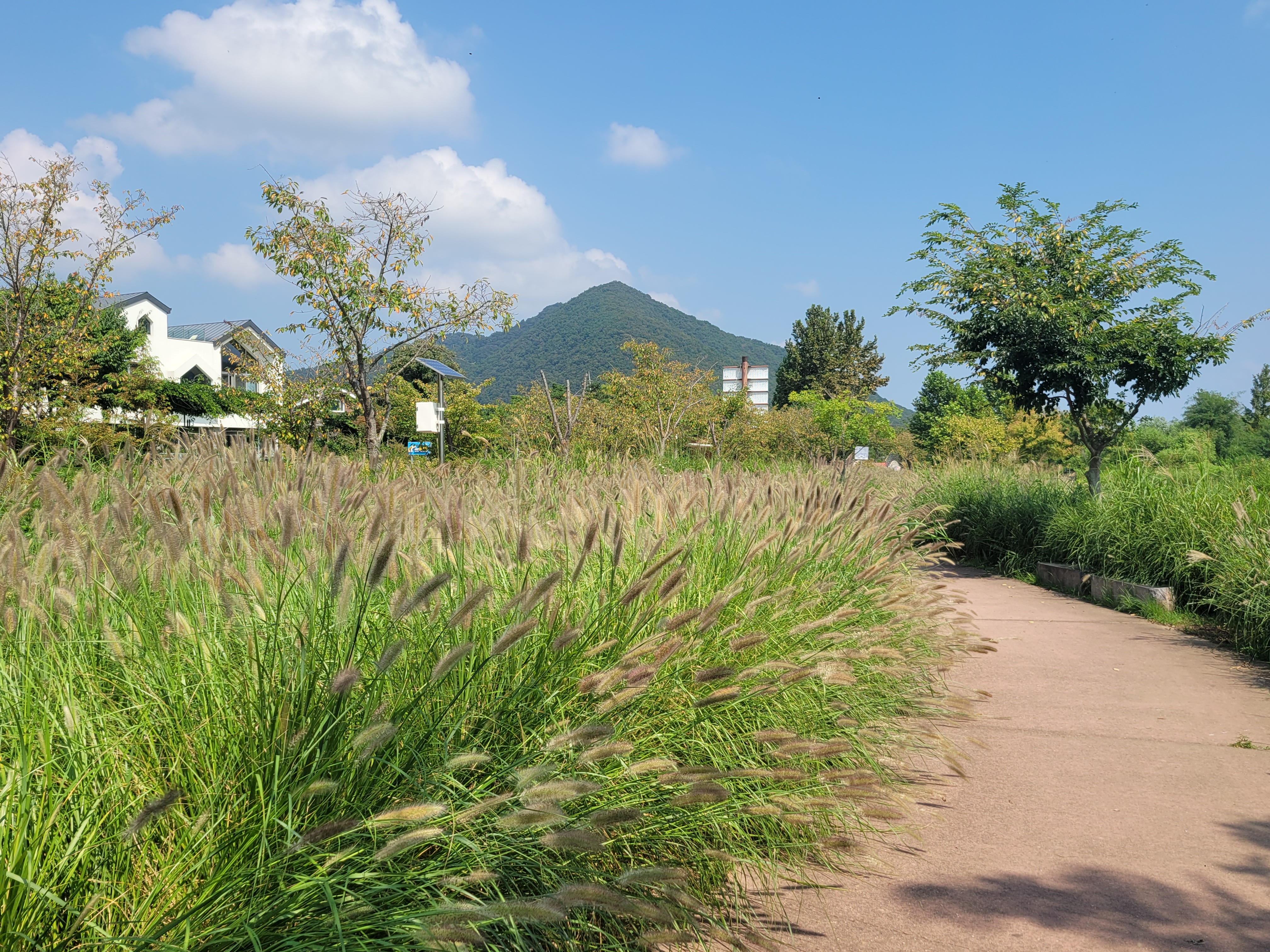 저는 산책로를 따라 물의정원 방향으로 걸었습니다. 앗! 그런데 수크령이 너울너울 춤을 추는 듯 반겨주었습니다. 수크령은 가을을 대표하는 식물 중 하나죠. 억새와 비슷한 외형을 가지고 있지만, 억새보다 조금 더 부드러운 잎과 꽃을 가진 것이 특징입니다.