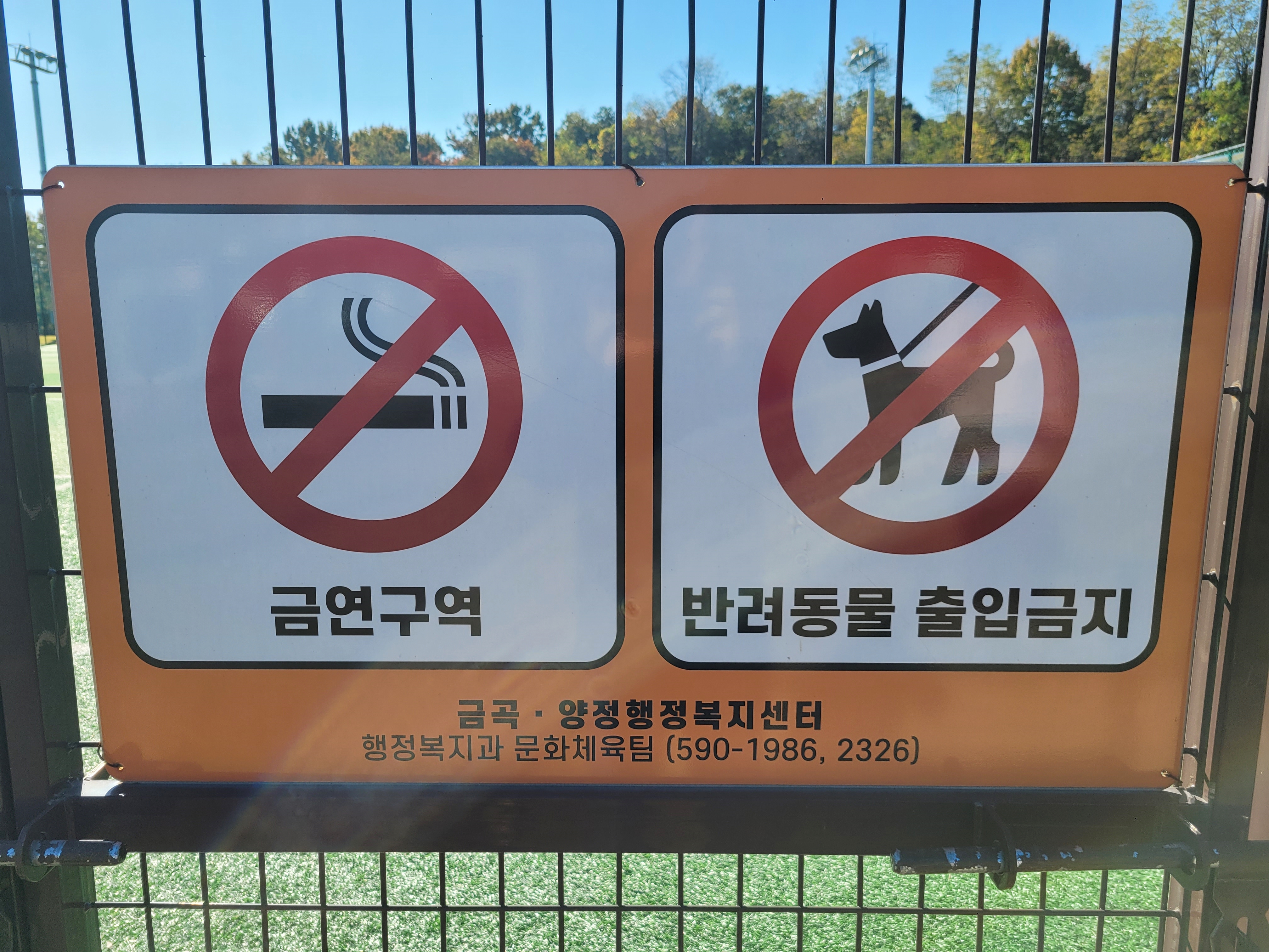 일패공원 축구장은 깨끗한 잔디 관리를 위해 반려동물 출입이 금지됩니다. 또한 남양주시의 모든 공원은 금연 구역입니다. 공원에서 흡연 시 과태료가 부과될 수 있는데요, 과태료가 문제가 아니라 아이들도 이용하는 곳이니 꼭 금연해야겠죠.
