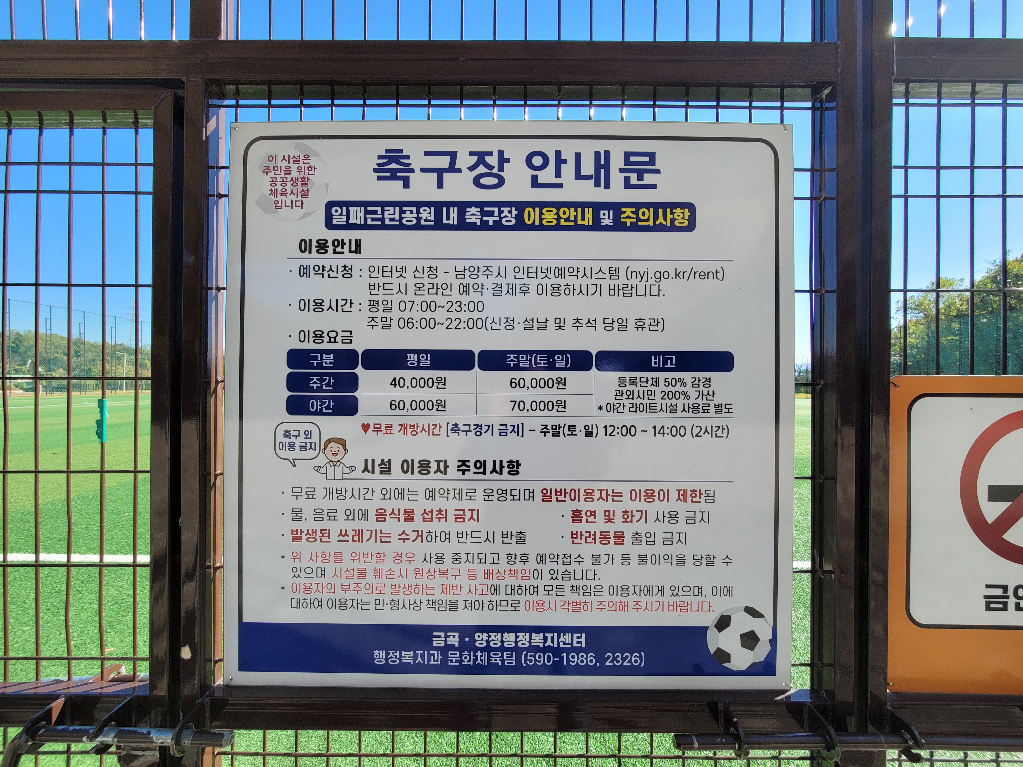 축구장 안내문을 보니 이용하려면 남양주시 인터넷 예약시스템으로 예약 신청하면 되고요, 이용 시간은 평일 07:00~23:00, 주말은 06:00~22:00까지입니다. 야간에도 조명을 켜고 운동을 할 수 있으니 직장인들이 이용하기 좋겠어요. 특히 주말(토·일)에는 12:00~14:00까지 2시간 무료 개방한다니 아이들이 마음 놓고 뛰어놀겠죠.