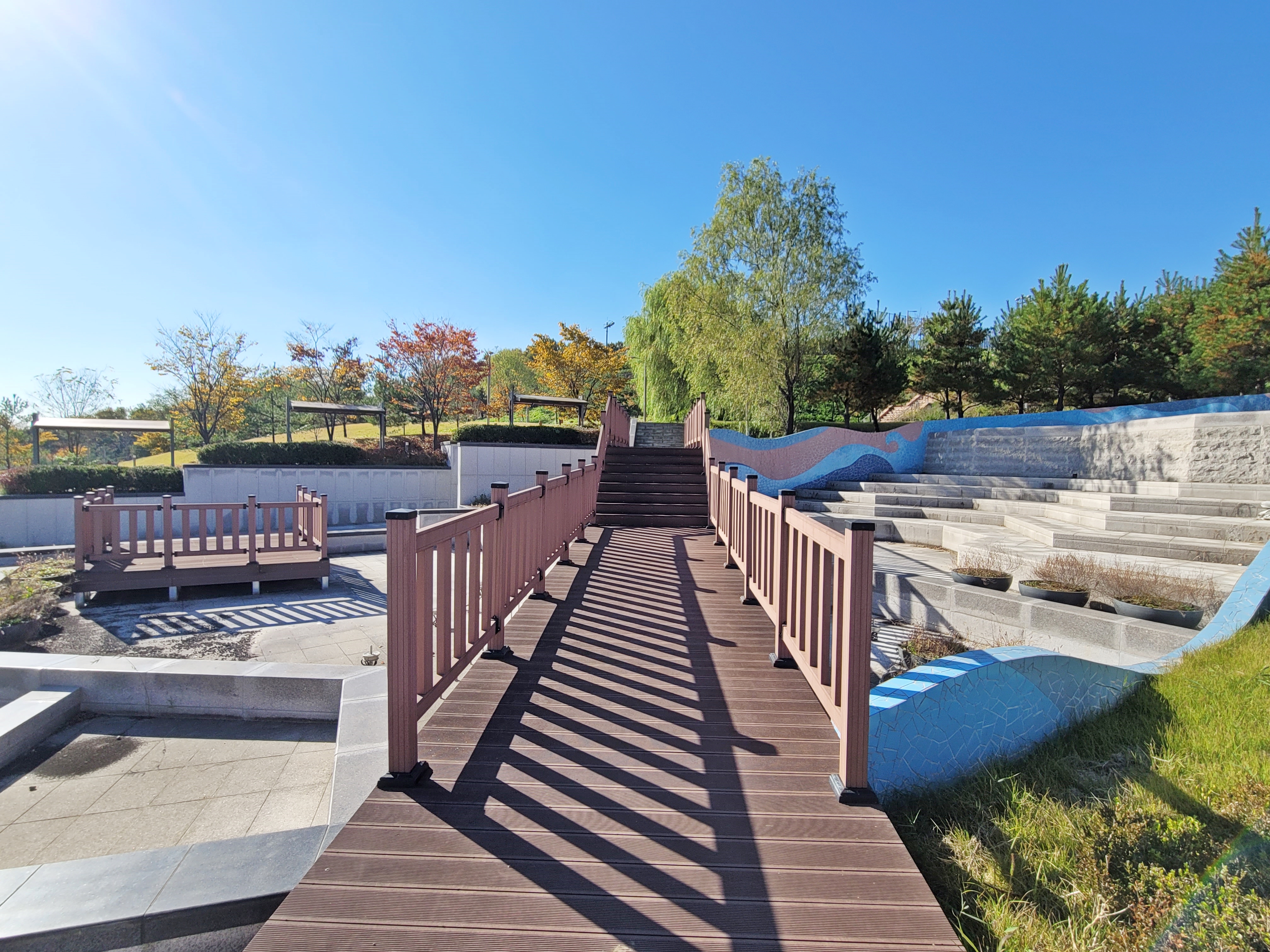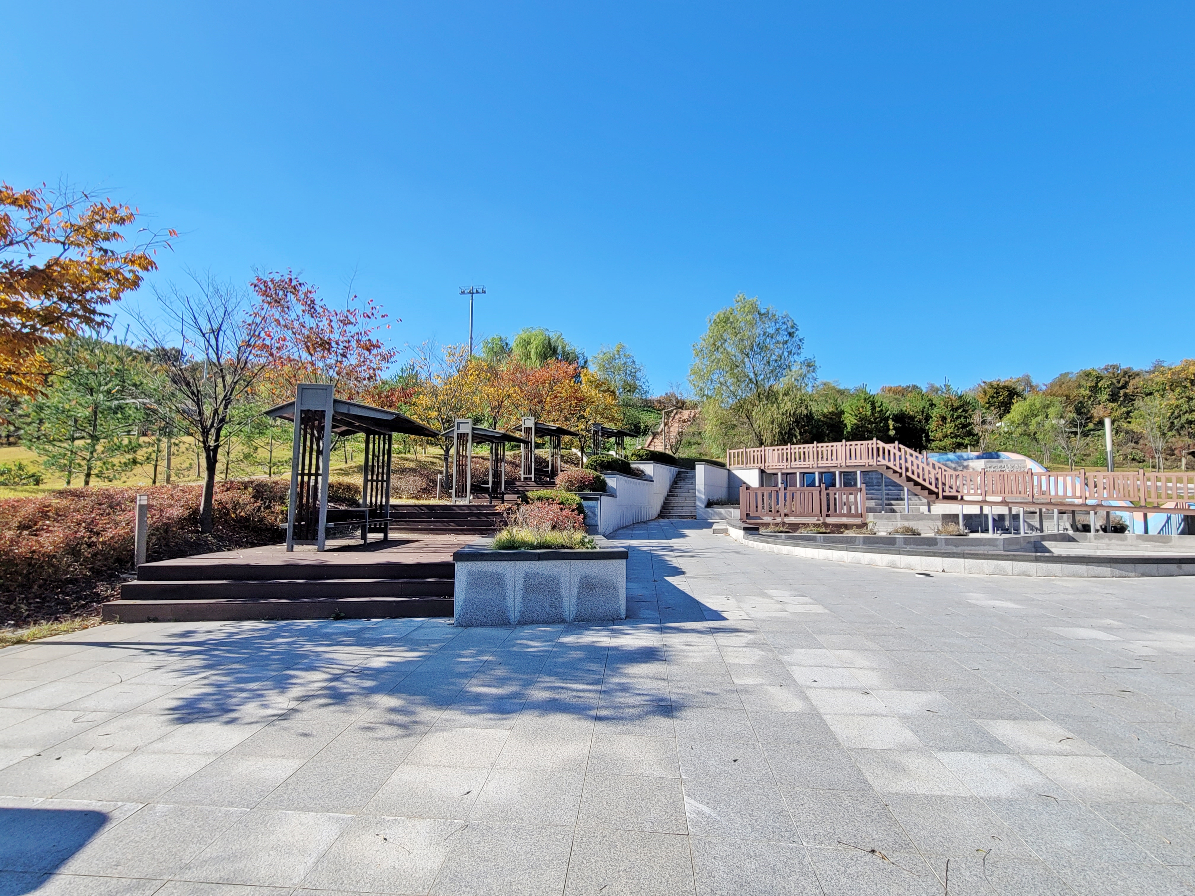 분수 위쪽에 데크 쉼터 여러 개가 있습니다. 쉼터 주변 나무들이 겨울 색으로 갈아 있습니다. 가족과 함께 와서 쉼터에서 만추 풍경과 초겨울을 느끼기에 좋습니다.