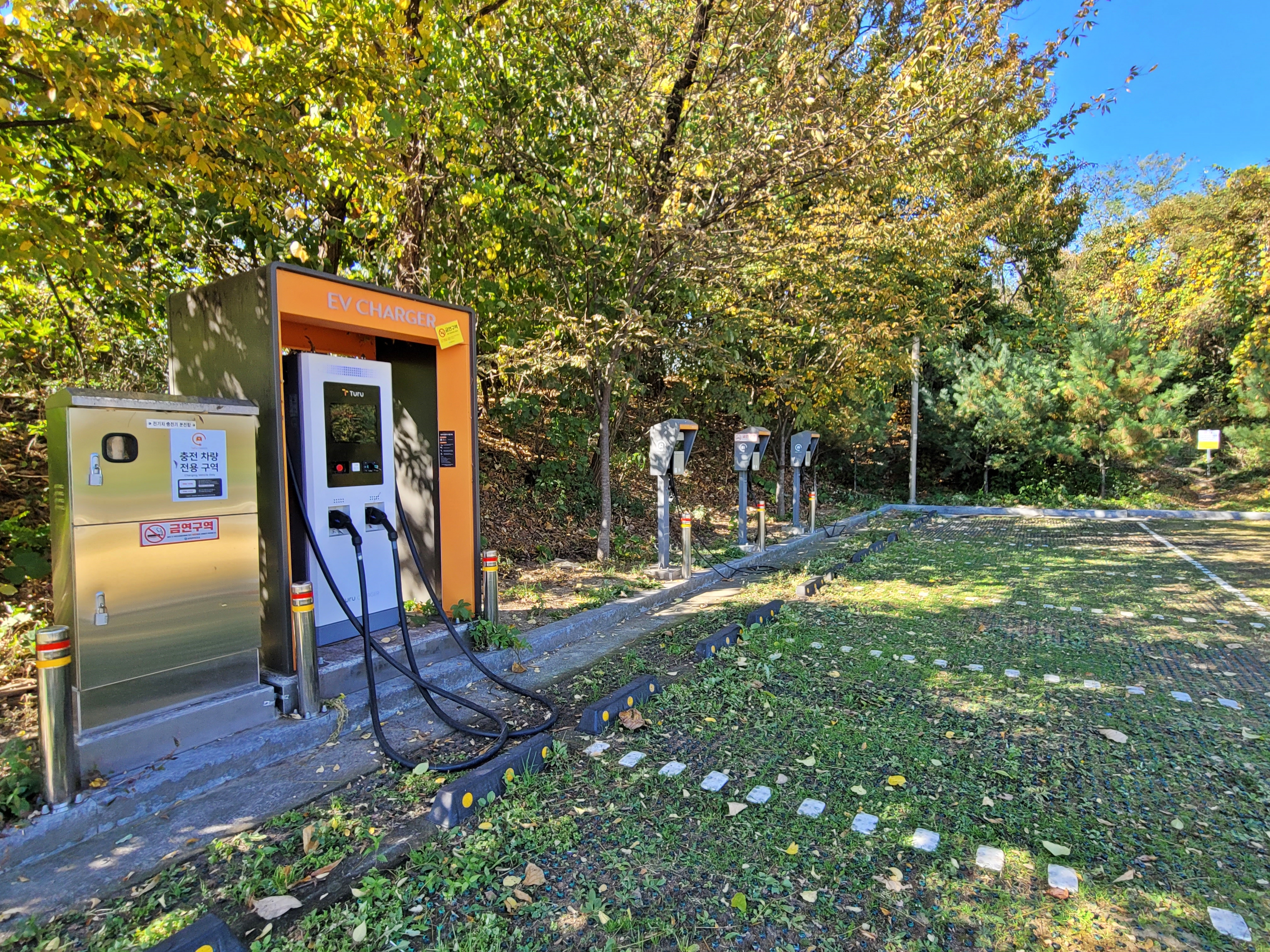 축구장 앞 주차장에는 전기 충전기가 있습니다. 전기차 충전기 앞에는 일반 자동차를 주차할 수 없는데요, 이런 것을 아주 잘 지켜주고 있네요. 전기차를 가져왔다면 공원에서 쉬는 동안 전기차를 충전할 수 있습니다.