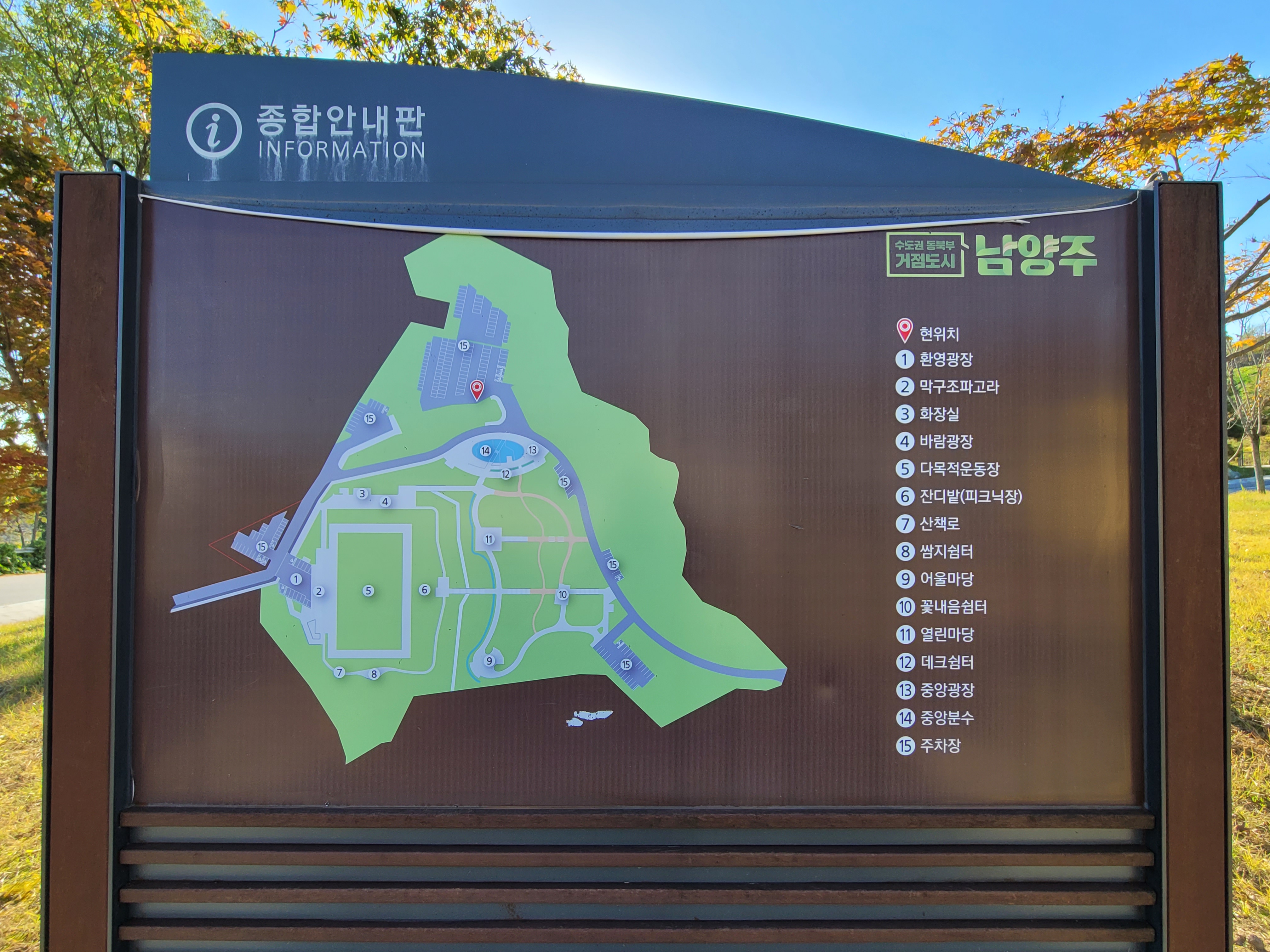 일패근린공원(이하 일패공원)은 이름 그대로 남양주시 일패동에 있는 공원입니다. 공원 안내판을 보니 환영광장, 파고라, 바람 광장, 다목적운동장(축구장), 잔디밭(피크닉장), 산책로, 데크 쉼터, 중앙광장, 열린 마당 등 다양한 시설을 갖추고 있습니다.