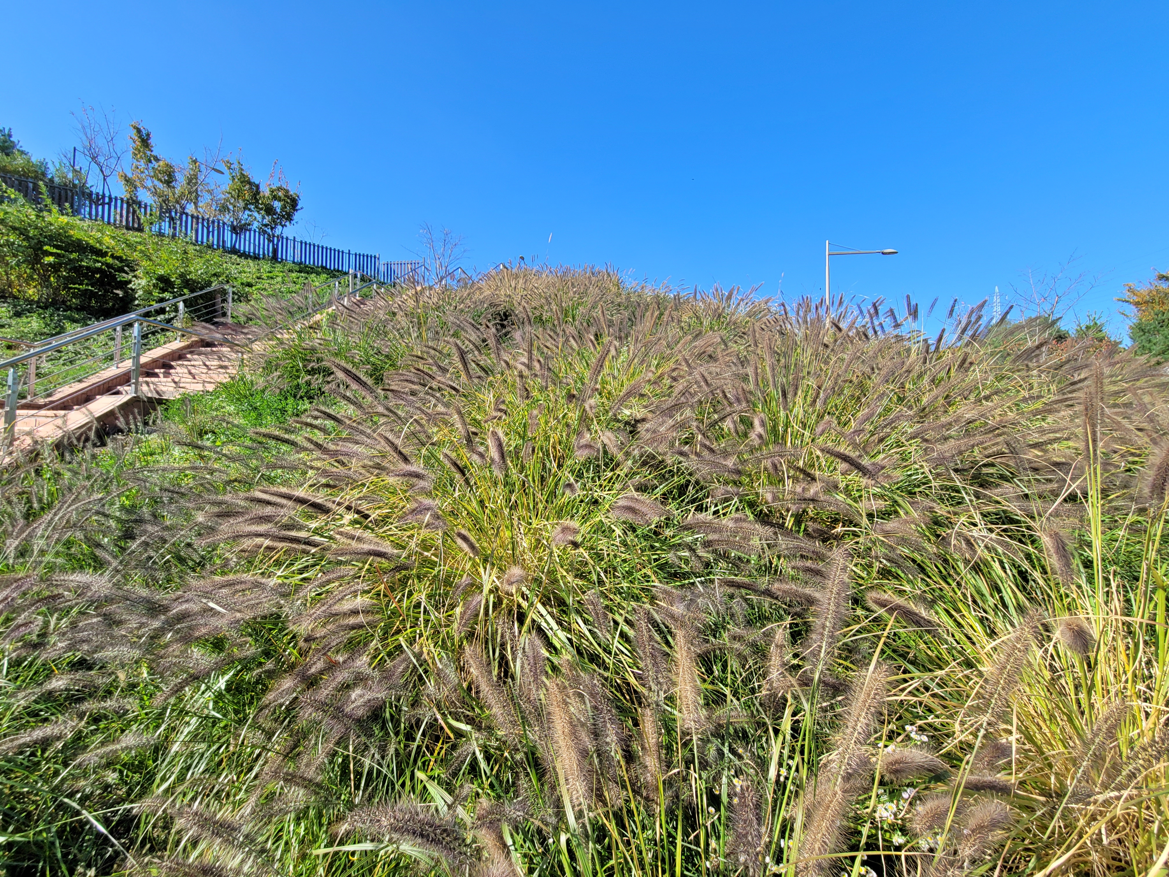 중앙광장에서 계단을 따라 다목적운동장(축구장)으로 올라가는데, 가을의 전령 수크령이 보입니다. 수크령은 가을에 은빛 또는 황금빛을 띠는 꽃이 피어 장관을 이루죠. 그래서 가을철 억새와 함께 사진 촬영지로도 인기가 높답니다.