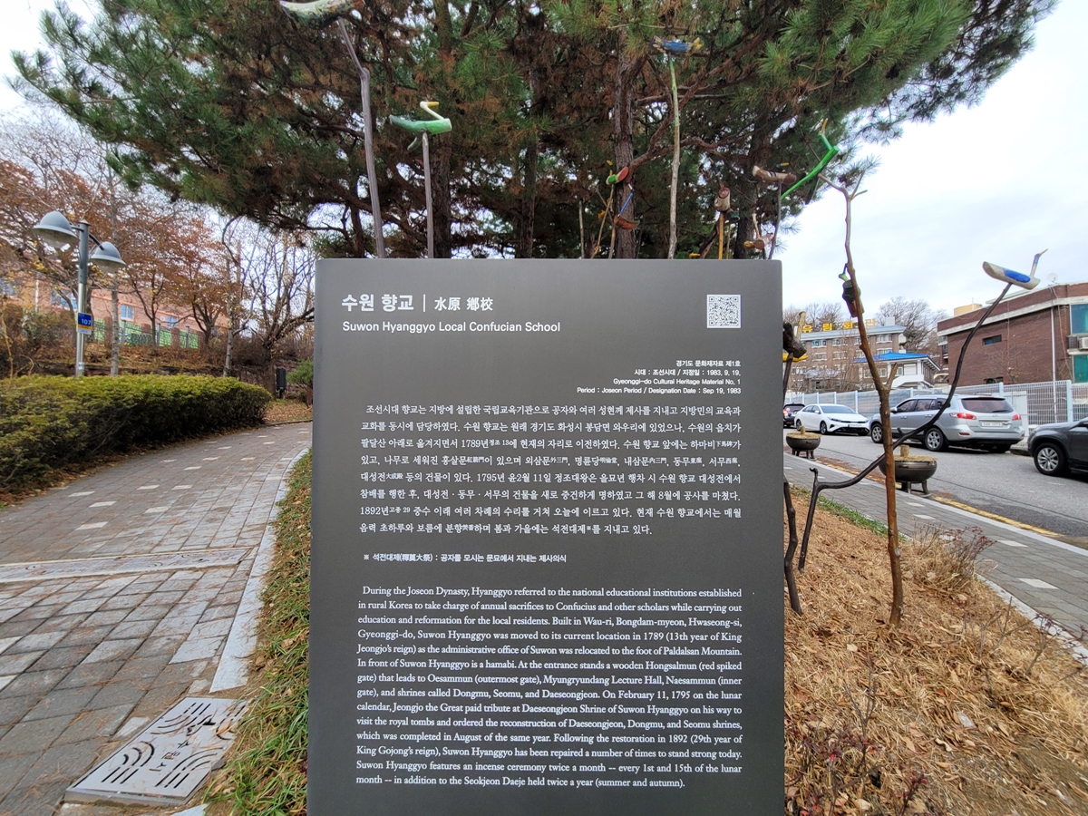 홍살문 옆에 교동 제158호 어린이공원이 있는데요, 이곳에 수원향교 안내판이 있습니다. 안내판을 보니 수원향교는 원래 경기도 화성시 봉담읍에 있었는데요, 수원의 읍치가 팔달산 아래로 옮겨지면서 1789년(정조 13)에 현재의 자리로 이전했습니다.