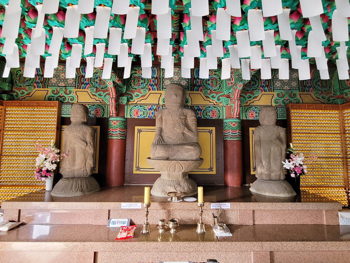 대적광전 우측에 아담한 용화각이 있습니다. 내부에는 석조여래좌상 1구와 석조보살입상 2구가 봉안되어 있는데요, 모두 고려시대의 불상으로 현재 경기도 유형문화재 제151호로 지정되어 있습니다. 안내판을 보니 이 삼존불은 1995년 대적광전 위쪽 언덕에 전각을 지으려고 터를 닦던 중에 발견되었으며 고려 불상의 특징을 잘 나타냅니다.