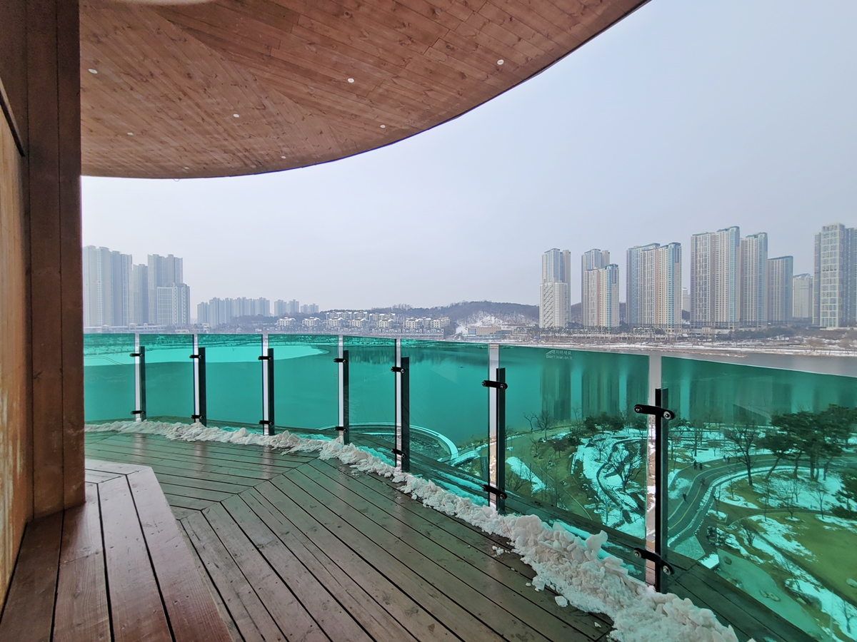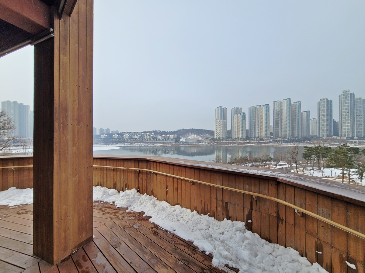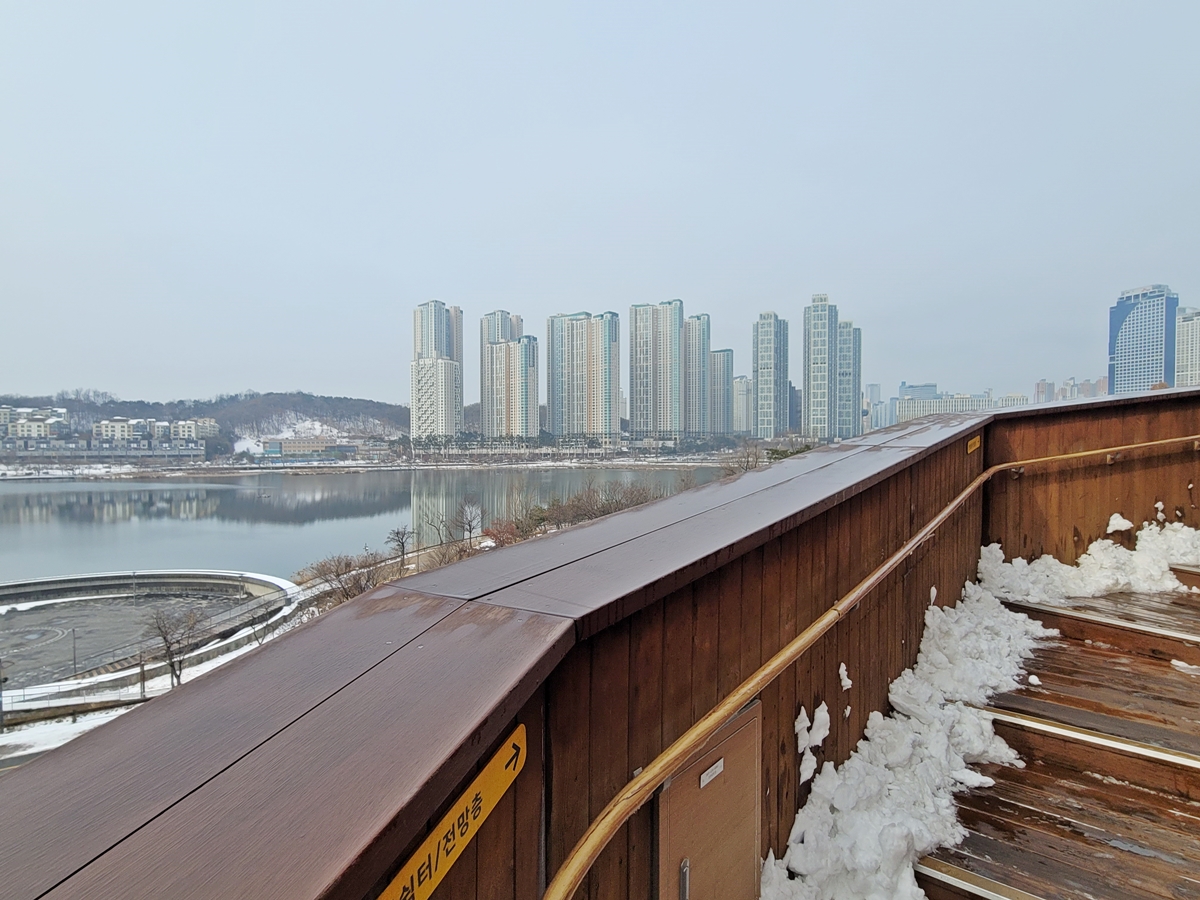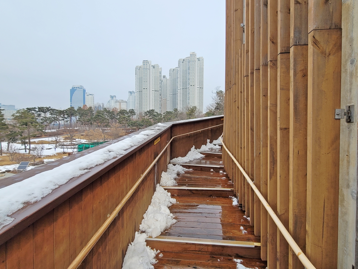 계단을 따라 올라 3층 전망쉼터에 도착했습니다. 엘리베이터를 타셔도 3층에 내리실 수 있어요. 전망쉼터는 호수공원을 360도 파노라마로 볼 수 있습니다. 이곳에서 호수 공원 뷰(view)를 보며 시간을 보내는 것만으로도 힐링이 됩니다.