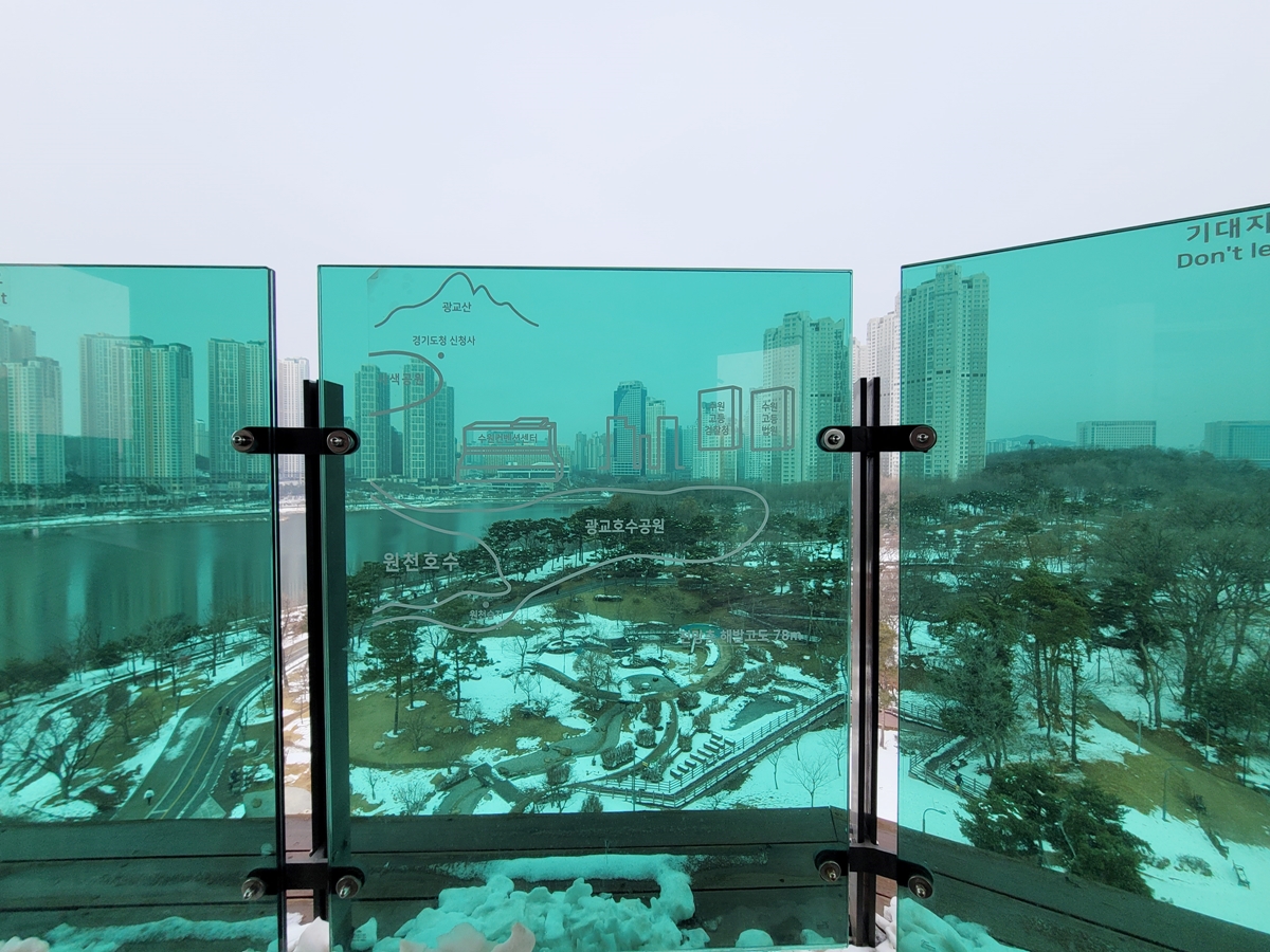 3층에서 한 바퀴 돌고 난 후 4층으로 올랐습니다. 3층과 비교해보면 유리 난간이 있고요, 유리에 전면으로 보이는 건물이 어떤 건물인지 알려주는 지도가 그려져 있습니다. 유리 난관에 기대면 위험하니 기대지 마세요! 4층에서 보니 하늘을 향해 우뚝 솟은 고층 빌딩이 수원 발전을 상징합니다.