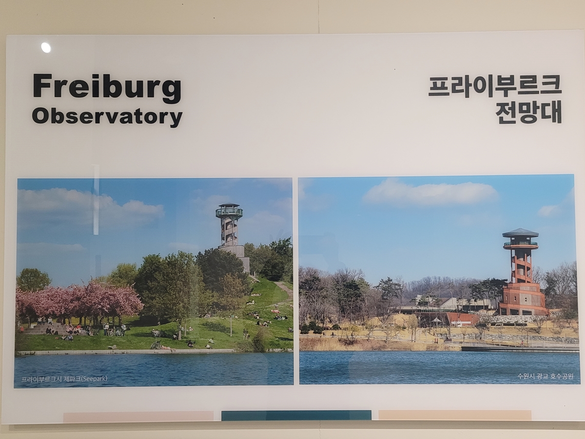 전시된 사진을 다 소개할 순 없고, 독일 프라이부르크 전망대와 수원시의 프라이부르크 전망대를 나란히 비교한 사진만 소개합니다. 프라이부르크 전망대 유래를 보니 독일의 환경 수도 프라이부르크시의 1986년 정원박람회 당시 호수공원을 조망할 수 있는 나선형 전망대를 목재로 만들었는데, 수원시에도 쌍둥이 전망대가 만들어졌네요.