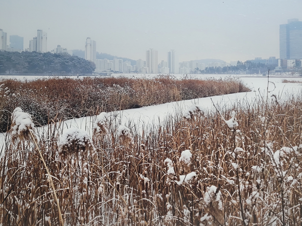 전시된 사진 중에서 요즘 겨울이라 그런지 원천호수 습지 설경을 담은 사진이 눈길을 끕니다. 딱 지금의 모습이죠. 사진작가들만 이렇게 멋진 사진을 찍는 게 아니죠. 여러분도 광교호수공원에 오시면 세상에서 하나뿐인 사진을 찍을 수 있습니다.