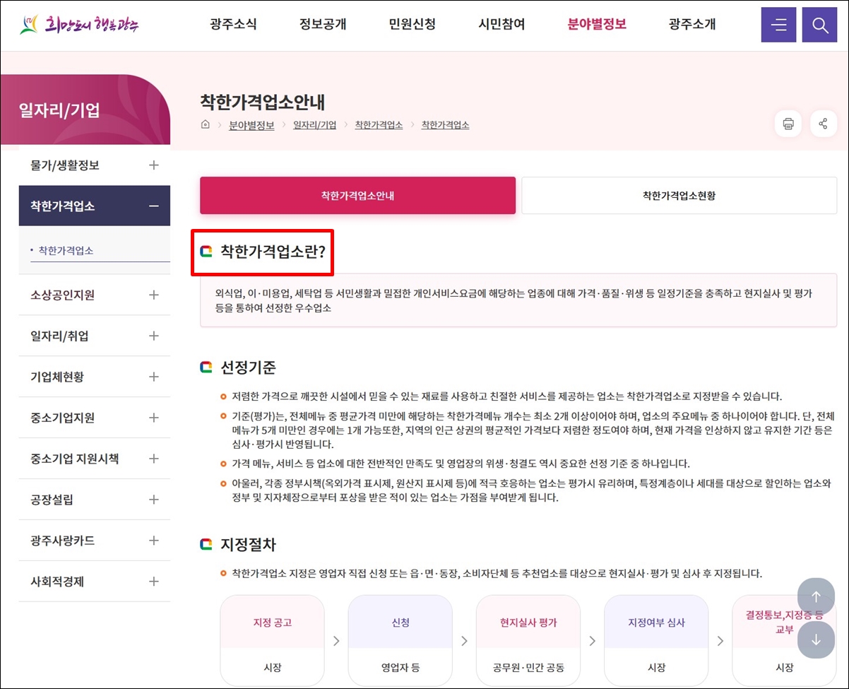 광주시청 누리집에서 보니, 착한가격업소란 외식업, 이·미용업, 세탁업 등 서민 생활과 밀접한 개인서비스요금에 해당하는 업종에 대해 가격·품질·위생 등 일정 기준을 충족하고 현지실사 및 평가 등을 통하여 선정한 우수업소를 말하는데요, 시청에서 심사를 거쳐 지정합니다.