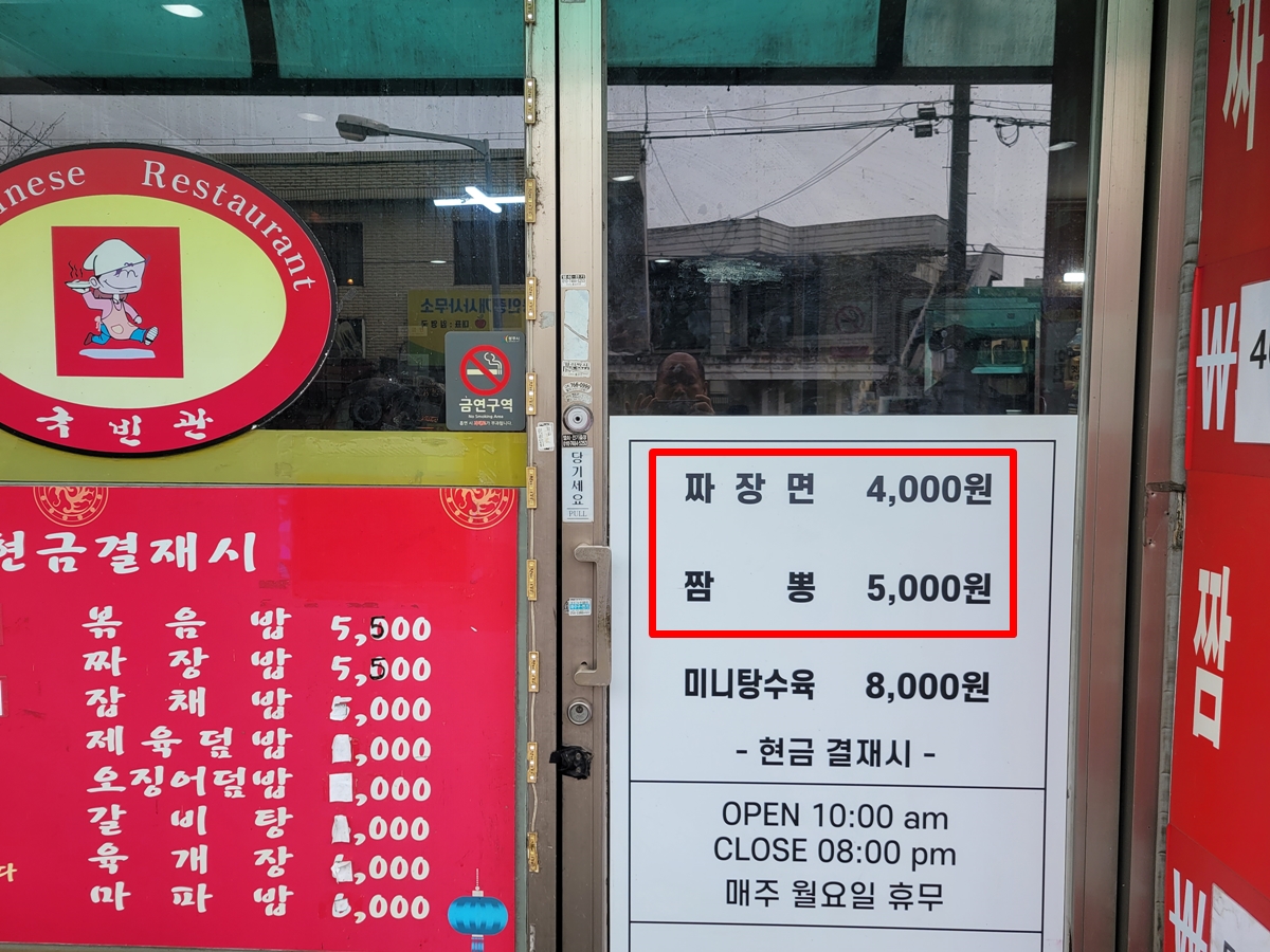 국빈관이 착한가격업소로 선정된 이유는 주요리인 짜장면값이 4천 원이기 때문인데요, 진짜 4천 원으로 팔고 있는지 확인도 할 겸 가본 겁니다. 직접 가보니 출입문에 짜장면이 4천 원이라고 쓰여 있는데요, 단 현금 결제 시라고 합니다.