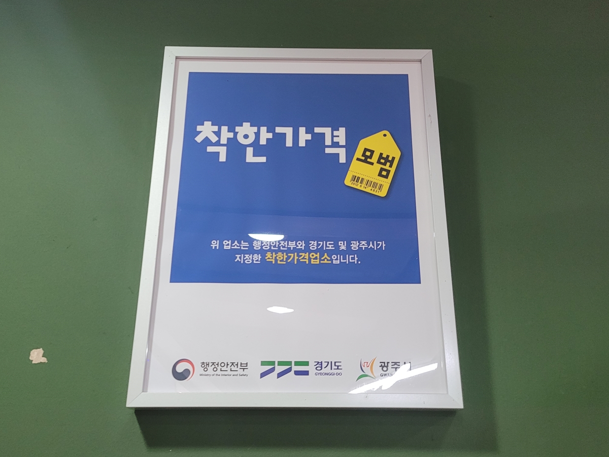 주문을 한 후 보니, TV 옆에 ‘착한가격업소’ 인증 현판이 붙어 있습니다. 이 식당이 광주시가 지정하고 인증한 착한가격업소란 증명인 셈이죠. 선정 기준을 보니 저렴한 가격으로 깨끗한 시설에서 믿을 수 있는 재료를 사용하고 친절한 서비스를 제공하는 업소라야 지정받을 수 있습니다.