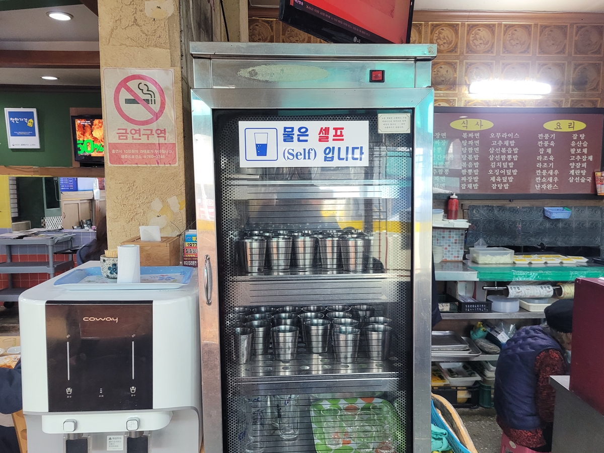 가격이 저렴하니 물 등은 셀프입니다. 바로 옆에 정수기가 있으니 가져다 먹으면 되죠. 물컵 등도 소독기에 들어 있어 안심하고 먹을 수 있습니다.