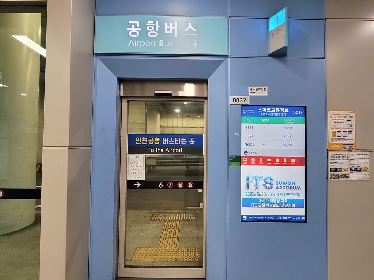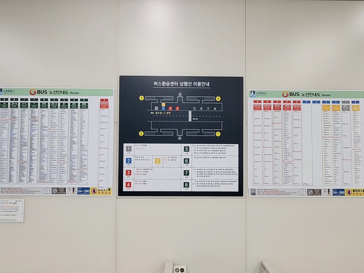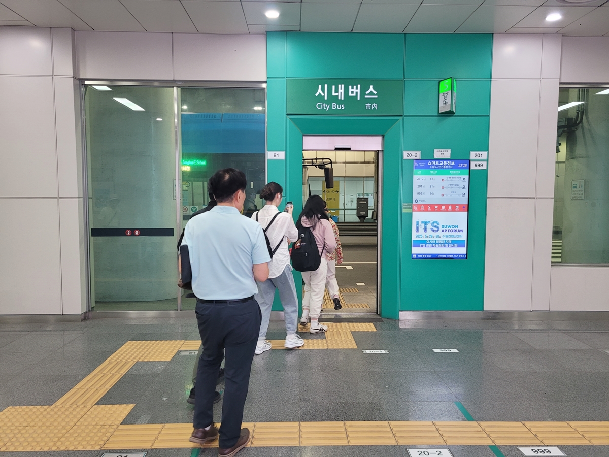 환승센터는 색깔별로 게이트를 만들었는데요, 게이트 옆에도 어떤 버스 노선이 정차하는지 스마트 교통 정보(키오스크)가 알려주고 있습니다. 초록색은 수원을 오고 가는 시내버스입니다. 탑승 게이트는 버스가 도착해야 문이 열립니다.