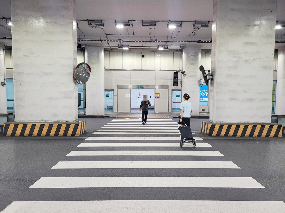 광교중앙역 환승센터는 탑승 홈이 한 곳이 아니라 두 곳입니다. 반대편 탑승 홈으로 가려면 횡단보도를 통해 안전하게 이동할 수 있습니다. 횡단보도는 적색 신호등이면 문이 열리지 않습니다. 녹색 신호등이어야 문이 열립니다.