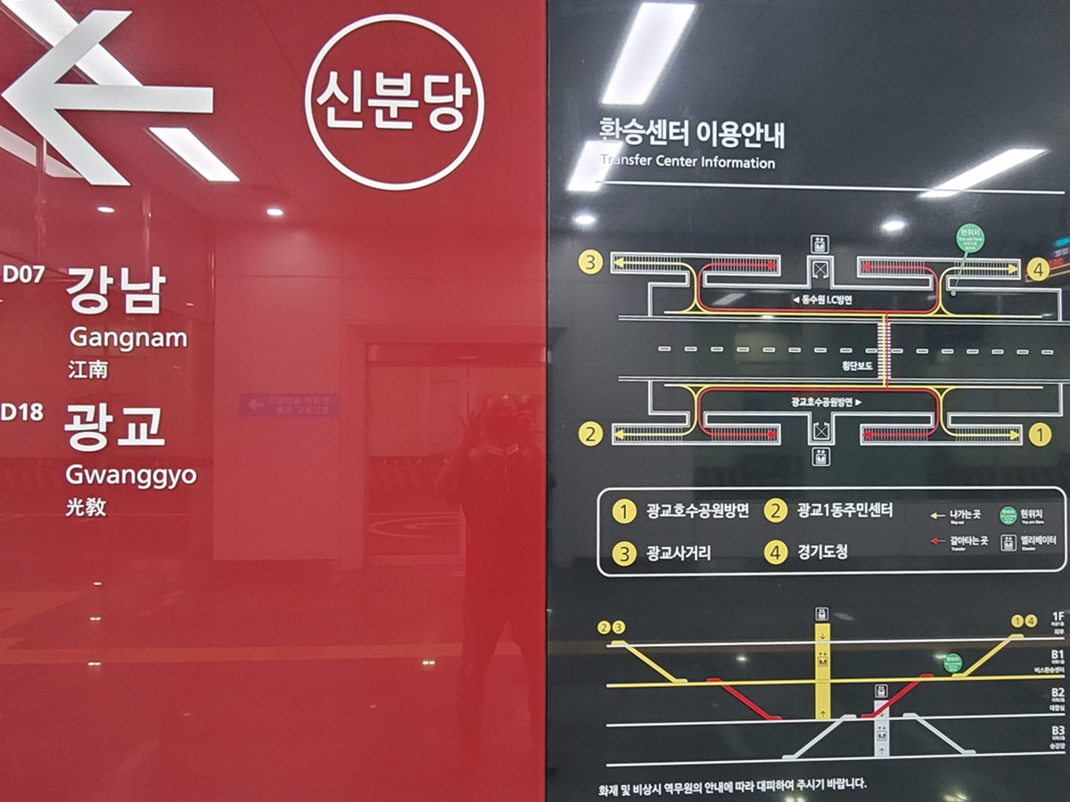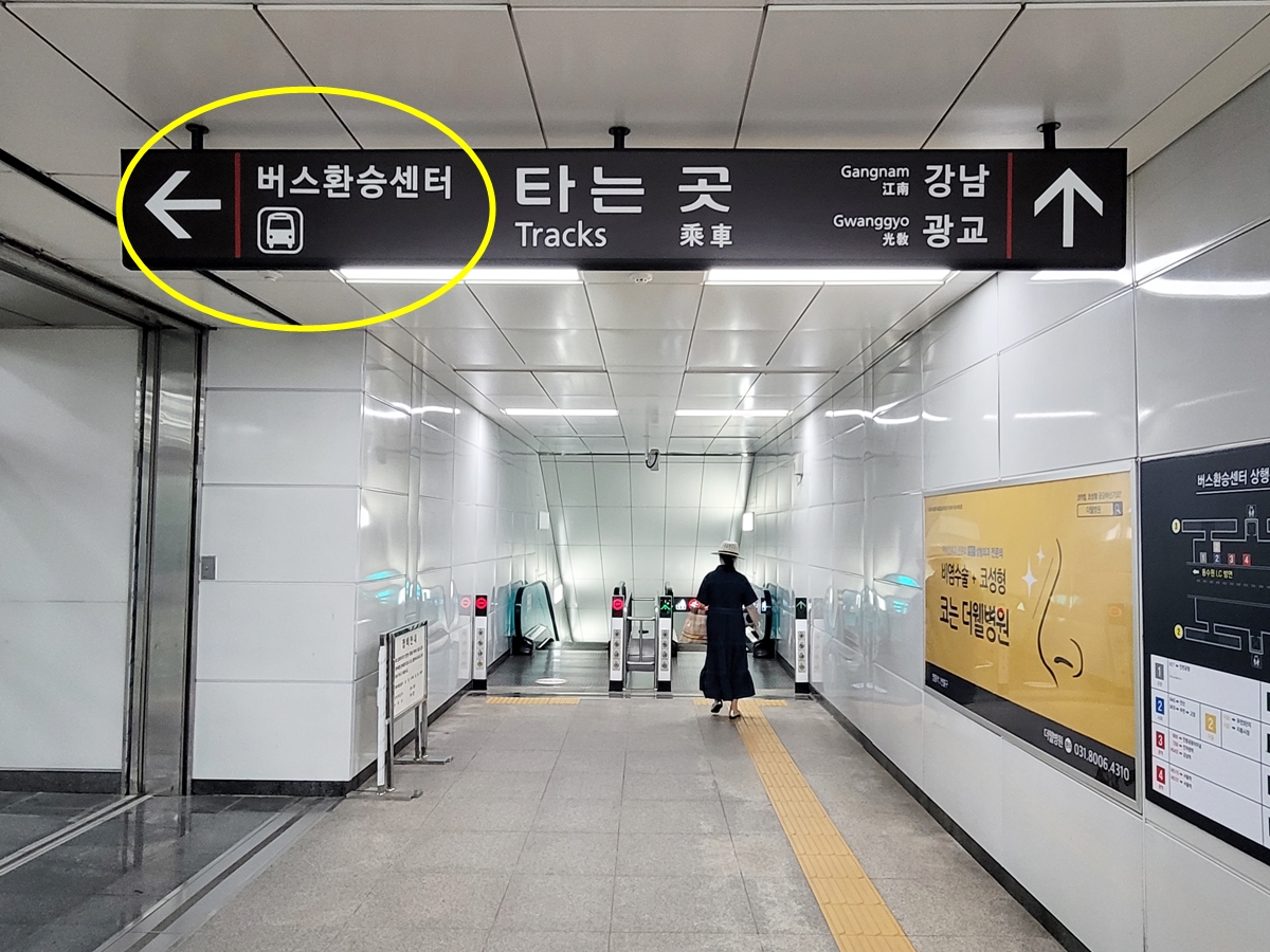 버스환승센터에서 신분당선을 이용하려면 에스컬레이터나 엘리베이터를 타고 한층 내려가야 합니다. 신분당선은 광교-광교중앙역을 거쳐 판교 강남까지 빠르게 갈 수 있어서 수원 시민의 중요한 교통수단 중 하나입니다.