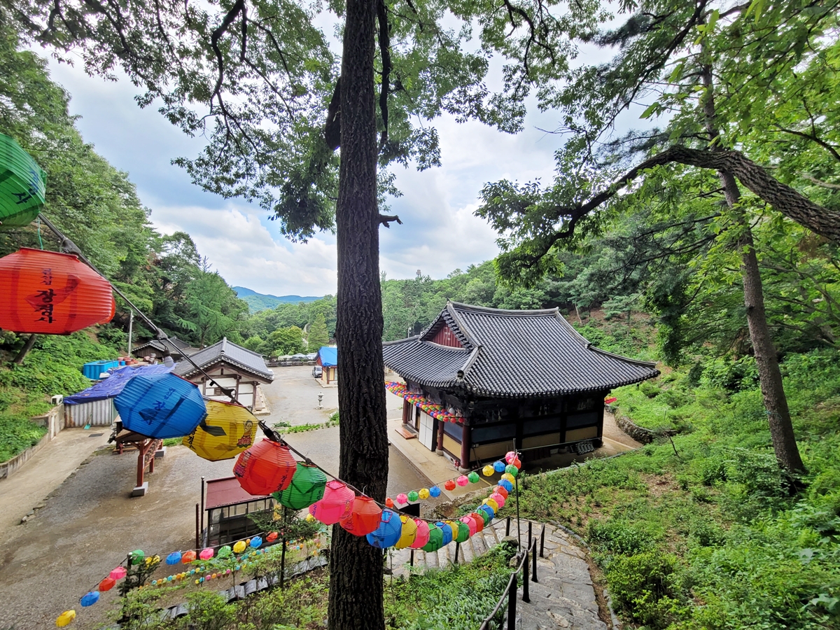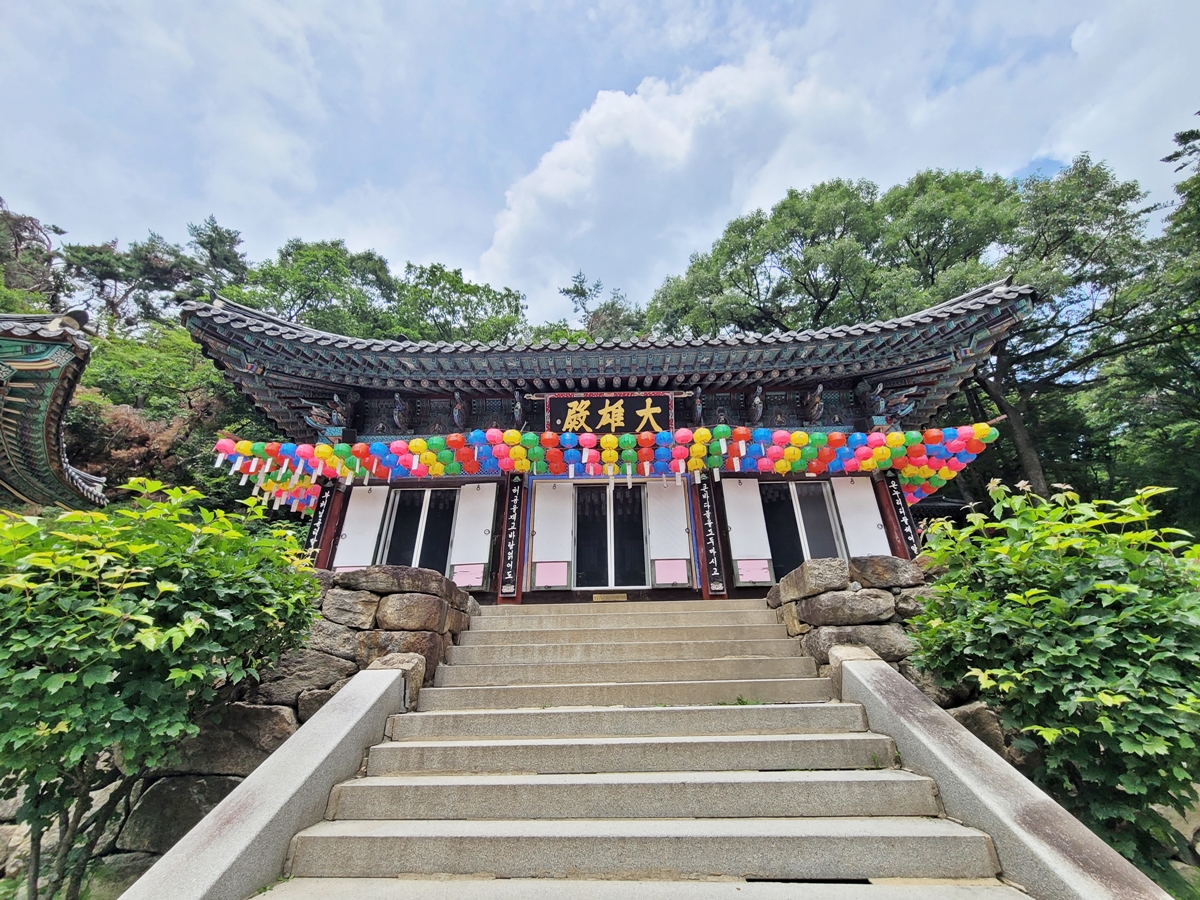 대웅전에 들어가 보니 석가모니불 세 분이 모셔져 있습니다. 천정에는 기원을 담은 연들이 빼곡하게 걸려 있습니다. 부처님의 가피(은혜)가 모두 함께하길 저도 합창하며 빌었습니다.