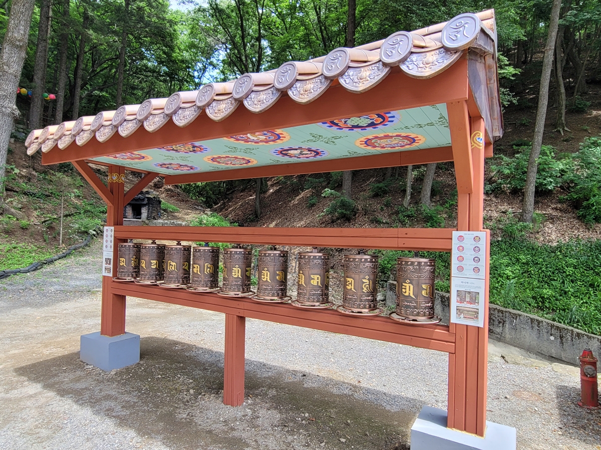 대웅전을 정면으로 바라볼 때 오른쪽 한쪽에 뭔가 특이한 게 있습니다. 이게 뭘까요? 가까이 가보니 여기에도 설명문이 붙어 있습니다. 티벳어로 ‘마니차’라 불리는 경통입니다. 경통 속에 불경이 들어있습니다. 경통을 돌리는 것도 하나의 수행 방법입니다.