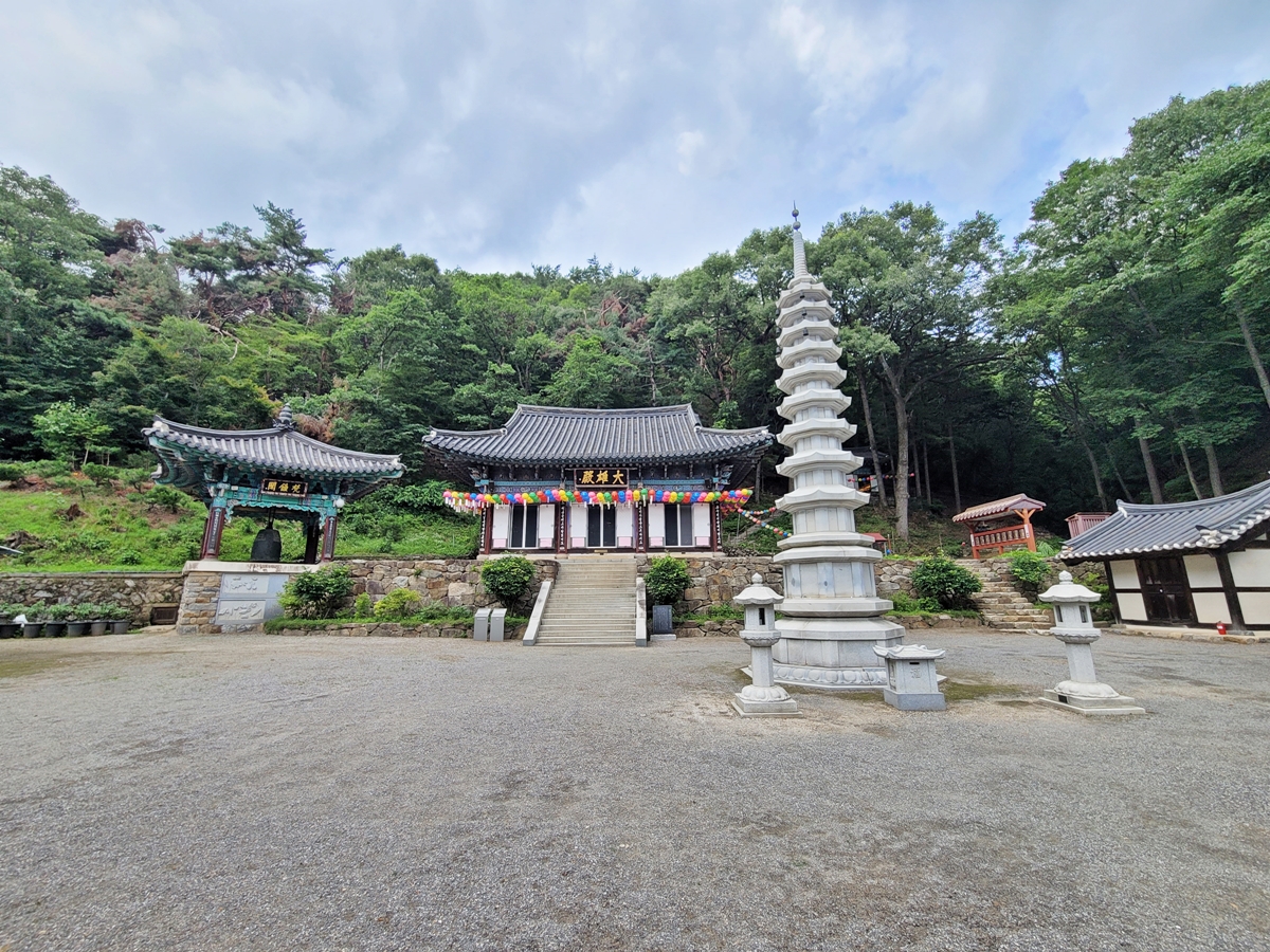 사찰 내에는 대웅전을 비롯해 심향당, 삼성각, 무심당, 범종각 등이 있었는데요, 그중 대웅전이 가장 크고 화려한 모습입니다. 먼저, 대웅전 쪽으로 가볼까요? 어느 사찰이든 대웅전이 가장 중앙에 있죠. 대웅전을 정면으로 본 모습입니다. 우측에는 석탑이 있습니다.