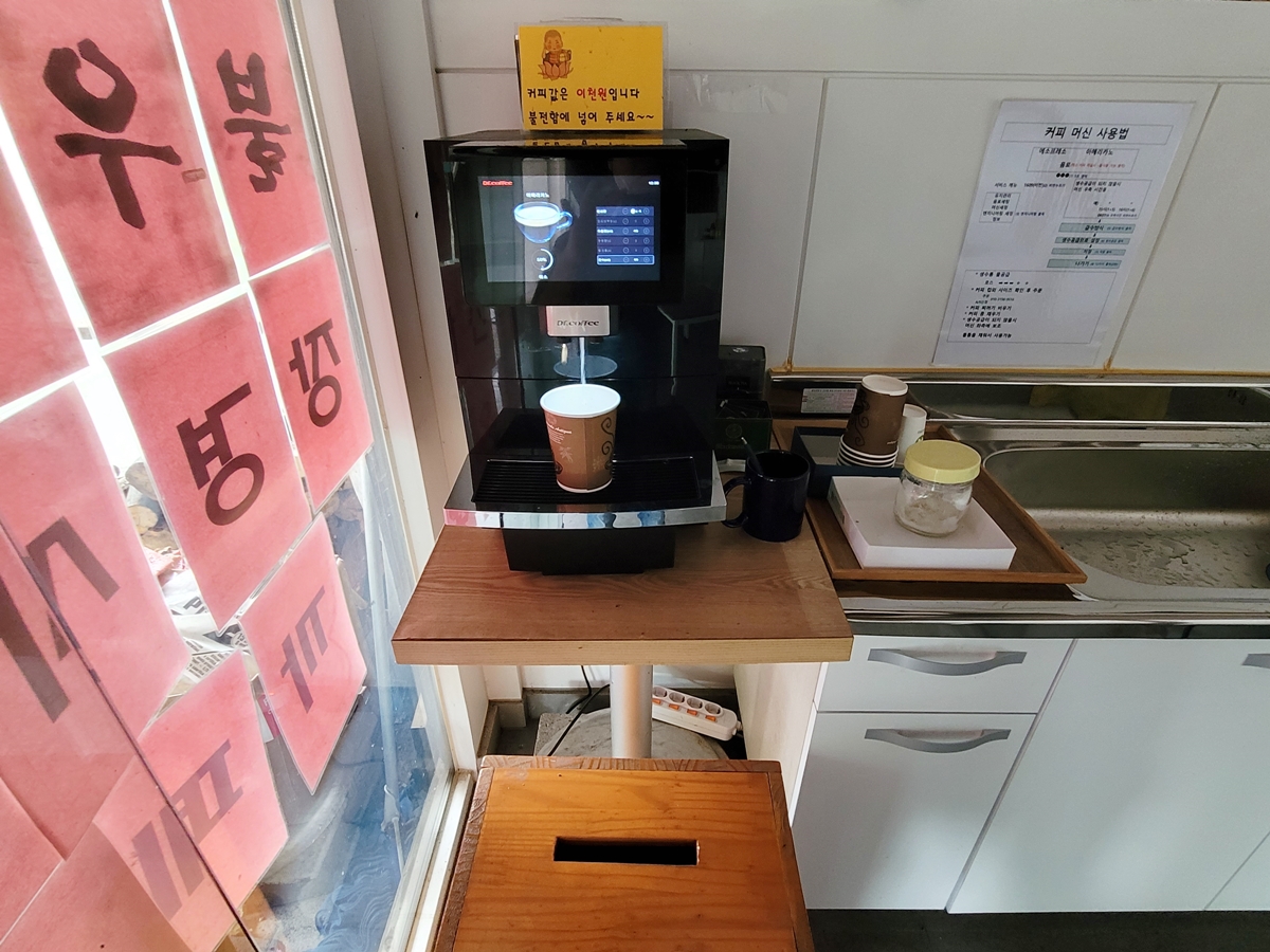 오랜만에 가보니 장경사에 카페가 생겼네요. 불우이웃을 돕기 위한 카페라고 합니다. 안으로 들어가니 커피 머신이 있는데, 셀프로 먹고 비용은 2천 원이라고 합니다. 불우이웃을 돕는다니 저도 한 잔 팔아줘야겠죠. 산사에서 마시는 커피 맛, 정말 좋습니다.