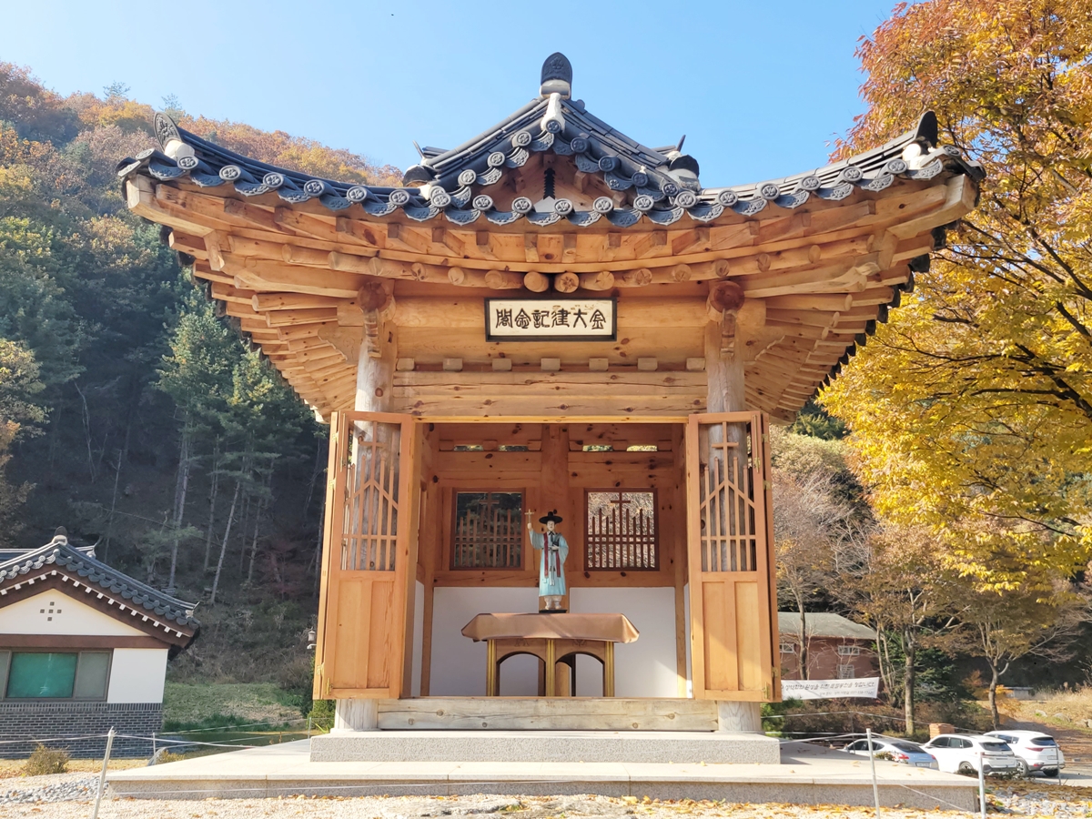 김대건 기념각은 1947년에 교우들의 뜻을 모아 김대건 신부의 기념 경당으로 지어졌으나, 6.25 전쟁 등으로 소실되었다가 본래의 건축 목적에 따라 은이성지에 복원(재현)된 곳입니다. 전통 양식의 작은 건물과 안내판은 기념각의 역사와 복원 배경을 설명하고 있습니다. 주변의 노란 단풍과 어우러져 한층 더 운치 있는 모습입니다.