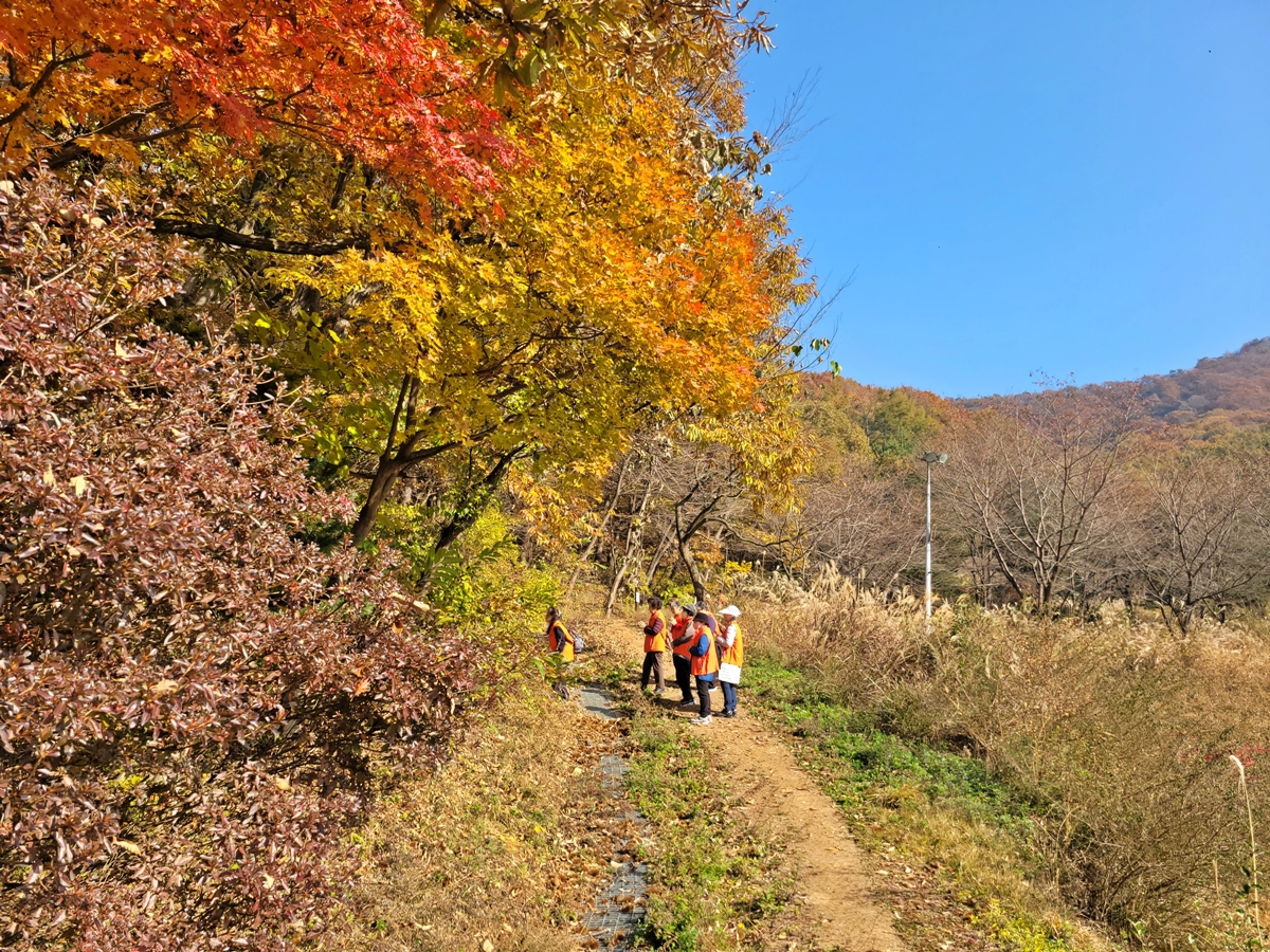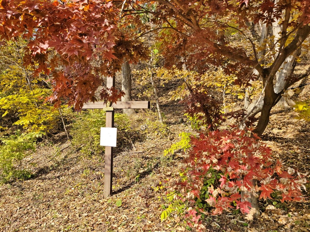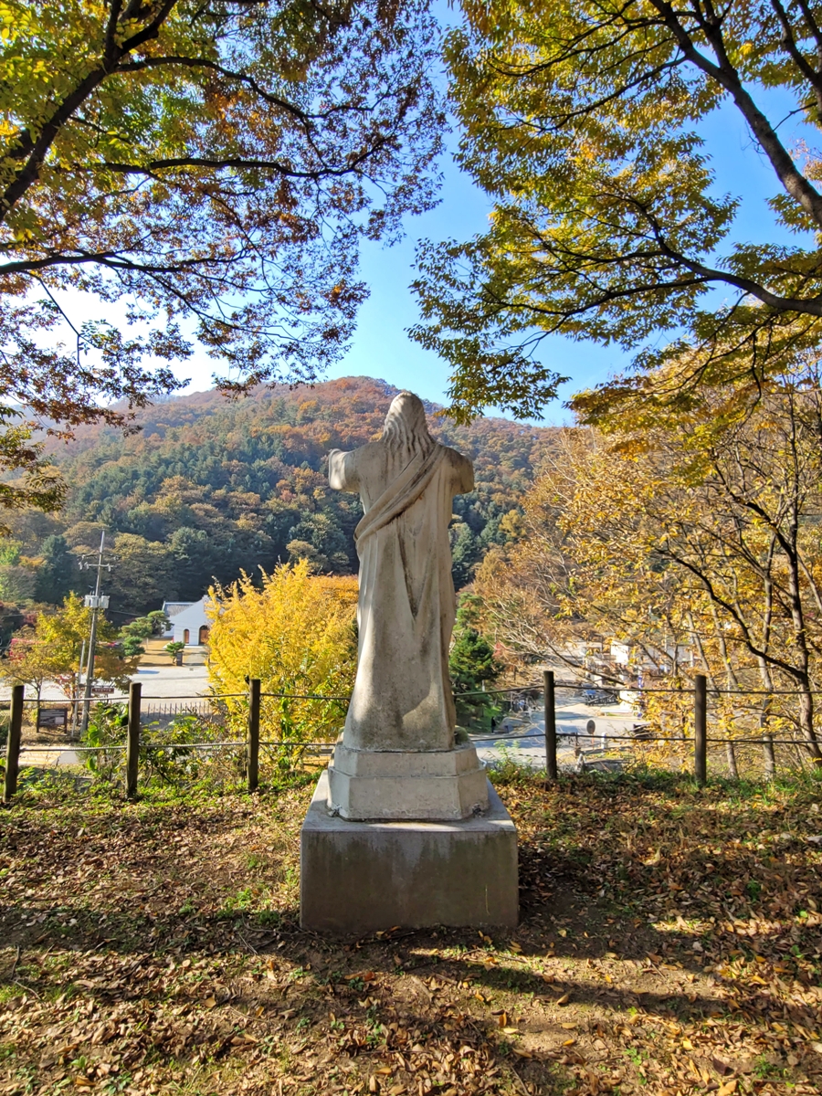 울창한 나무와 낙엽이 덮인 흙길은 만추의 분위기를 물씬 풍기며, 순례객들에게 영적인 평화를 안겨줍니다. 많은 천주교 신자가 십자가의 길 기도를 올리고 있습니다. 주변을 보면 붉은 단풍이 성지라기보다 단풍 명소라는 생각이 들었습니다.