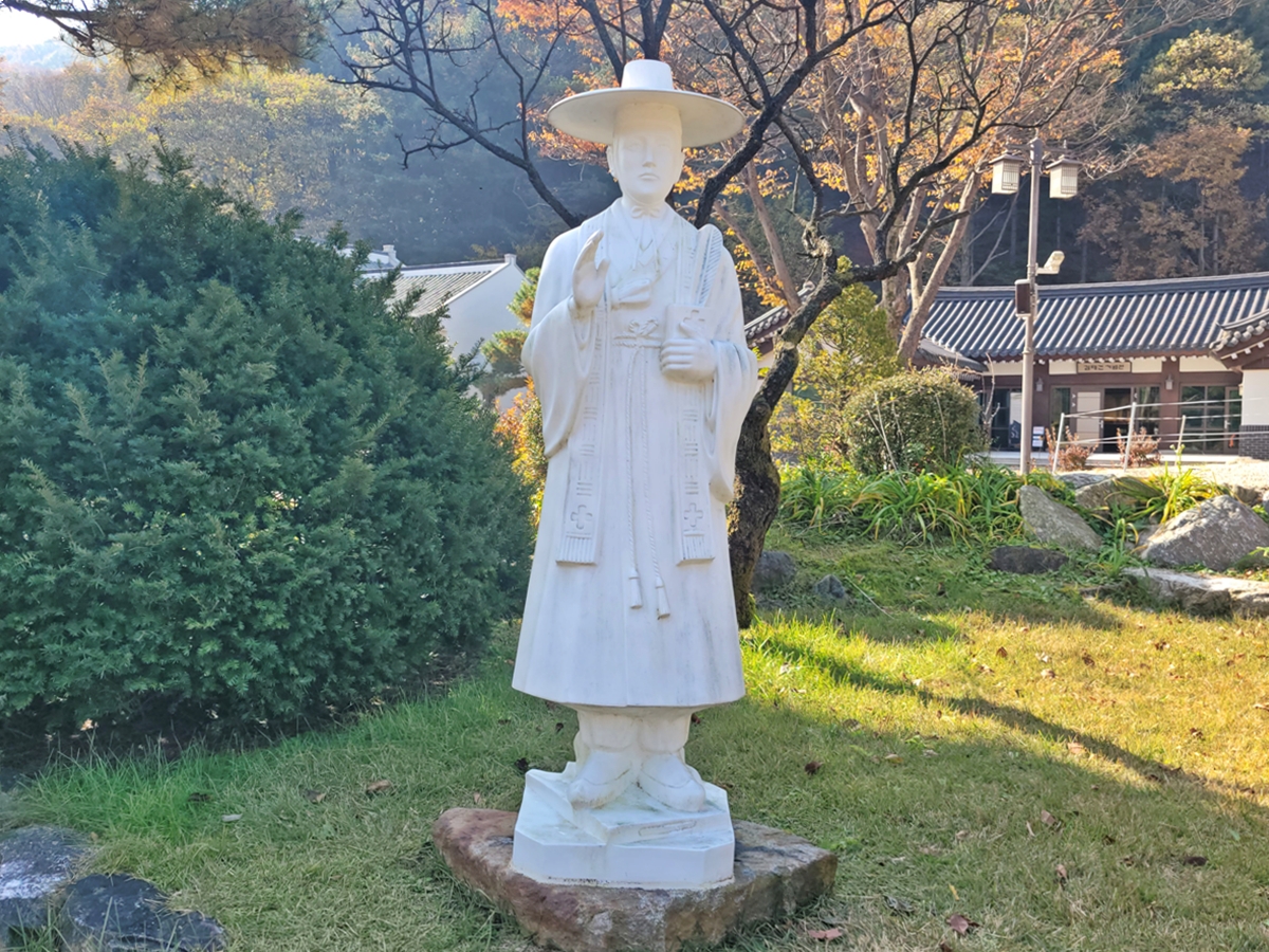 전통 한옥의 멋을 살린 김대건 기념관과 세례를 받는 김대건 안드레아 신부의 모습을 표현한 조형물이 가을 햇살 아래 평화로운 분위기를 자아냅니다. 그리고 그 앞에서 만추 풍경을 느긋하게 즐기는 사람들의 모습이 보입니다.