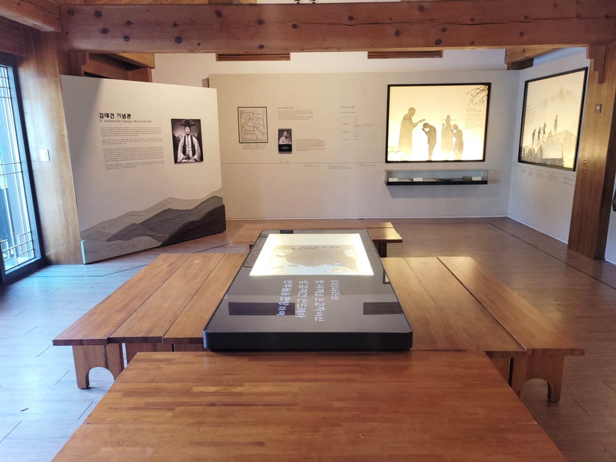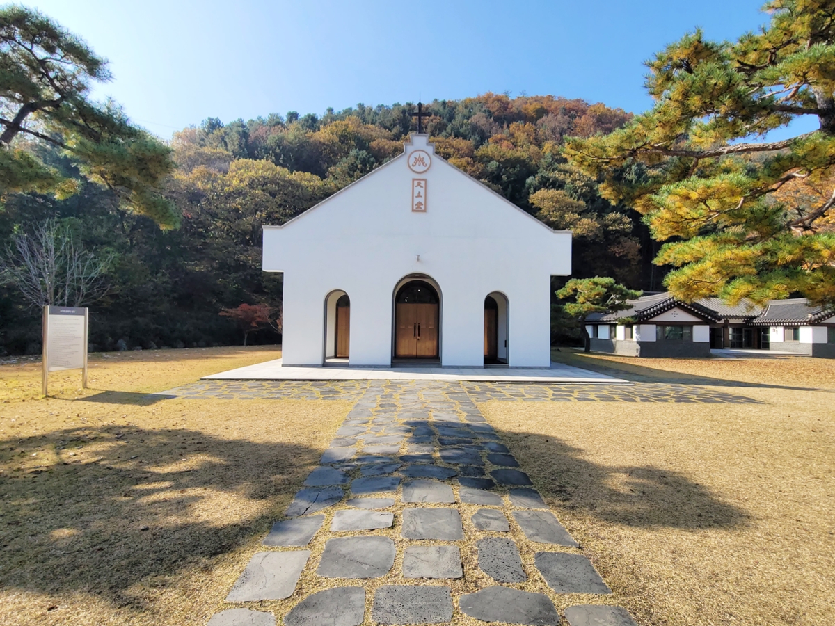 김대건 기념관은 김대건 신부의 생애와 발자취, 그리고 은이성지의 역사를 담은 귀중한 자료와 유물들을 전시하고 있습니다. 순례객들이 신부님의 굳건한 신앙심과 희생정신을 되새길 수 있는 교육적인 공간입니다. 만추의 풍요로운 색감 속에 고요히 자리 잡은 기념관은 역사를 묵상하기에 최적의 장소입니다.