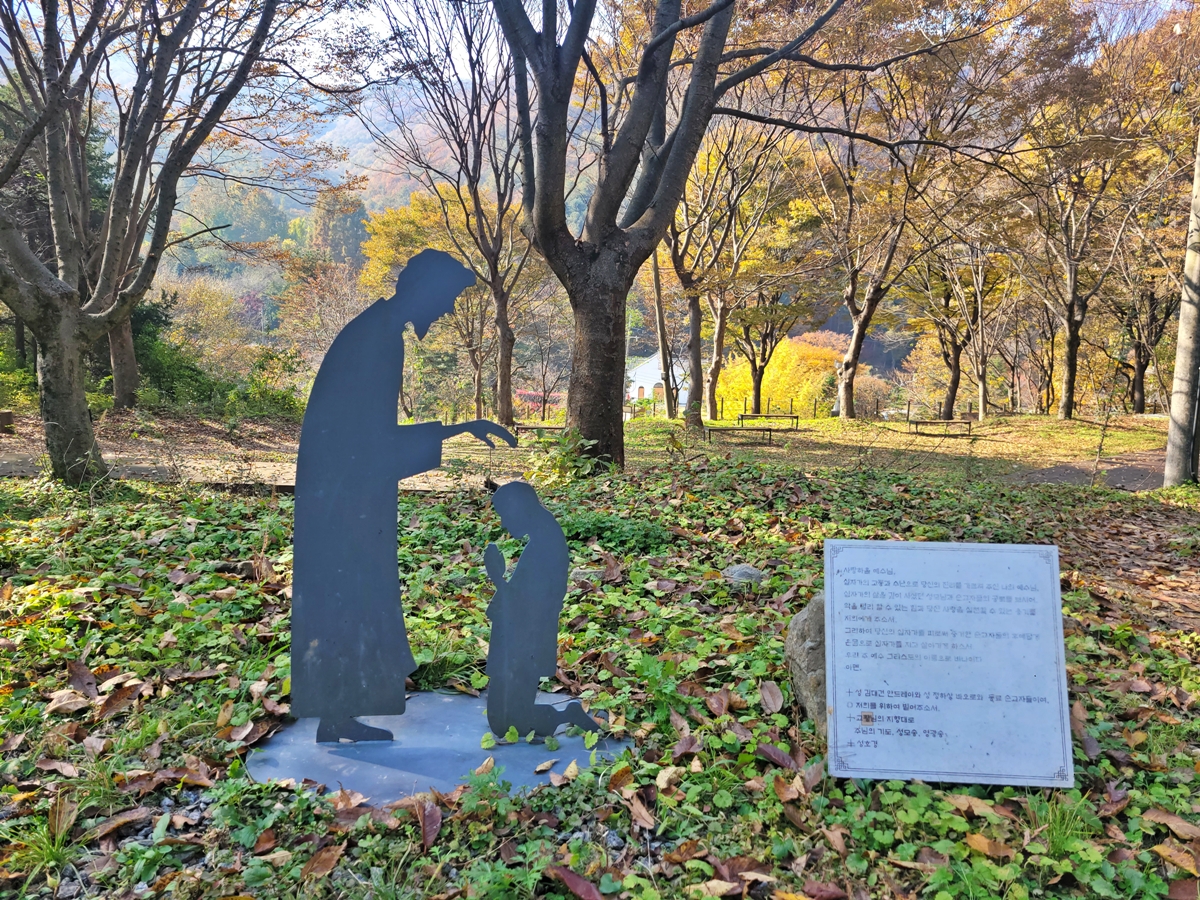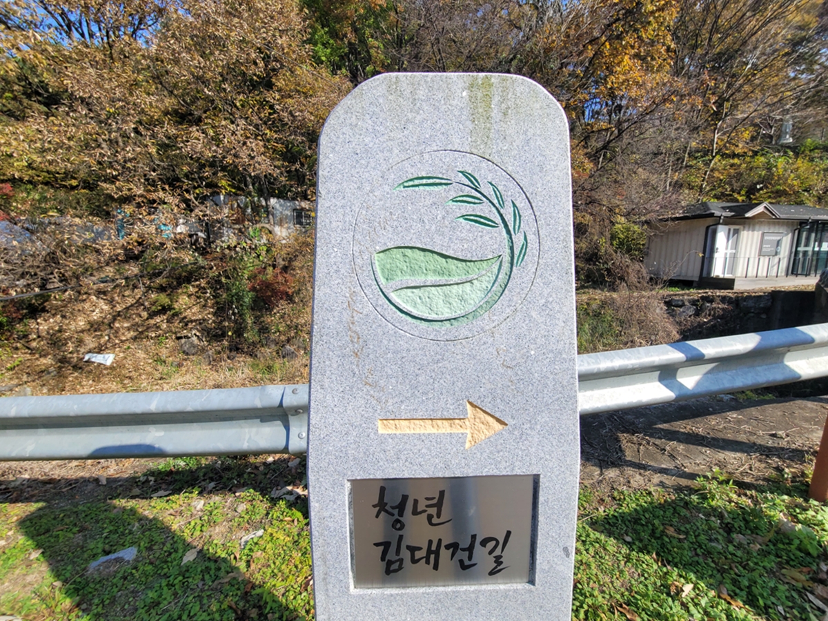 실루엣 조형물과 함께 '청년 김대건의 길을 걷다'라고 쓰인 표지판 주변으로는 붉은 단풍과 푸른 하늘이 대비되어 청년 김대건의 강인한 발자취를 따라 걷는 듯한 감동을 선사합니다. 만추 풍경을 보며 청년 김대건 길을 걸어보는 것도 좋을 듯합니다.