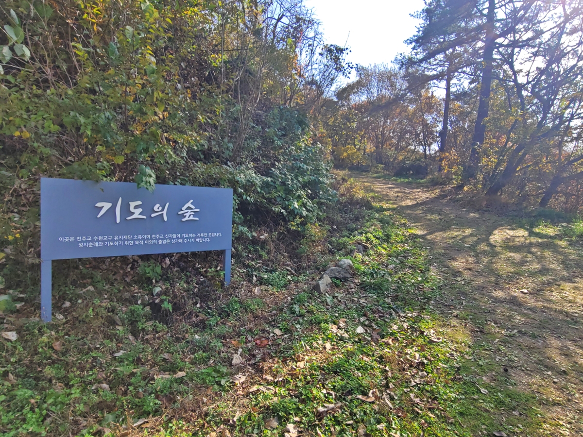 은이성지 맞은 편에 성지 깊숙한 곳으로 이어지는 '기도의 숲' 입구 표지판이 보입니다. 순례자들이 고요한 숲길을 따라 묵상과 기도를 할 수 있는 곳입니다.
