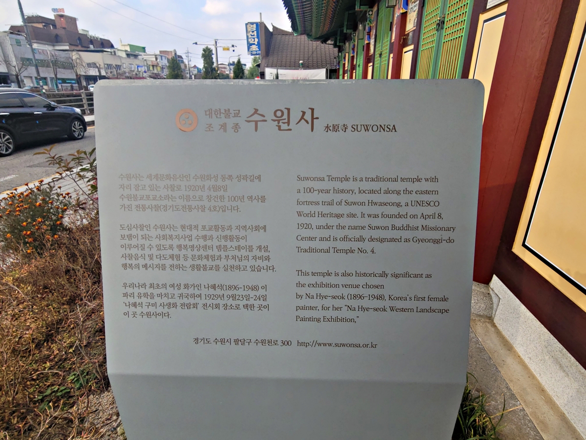 수원사는 화려한 관광지라기보다는 100년의 역사가 오롯이 담긴 살아있는 수행처의 느낌이 강했습니다. 특히 한국 근대 여성 예술의 선구자인 나혜석 화가의 발자취가 남아있는 곳이라는 점에서 역사적 의미가 새롭게 다가왔습니다. 사찰이 주는 고요함과 전통 한옥의 아름다움, 그리고 사천왕상과 보살상에서 느껴지는 압도적인 불력은 도심 속 번잡함을 잊게 해주는 귀한 시간이었습니다.