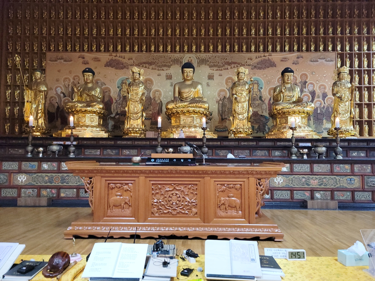 3층의 만불보전(萬佛寶殿)은 아미타부처님과 석가모니불, 약사여래불 삼존불과 협시불, 문수, 보현, 관음, 지장보살님이 있습니다. 또한 상단 뒤로 지장보살(총 302불)을 모셨으며, 법당 좌우로 봉안자들의 원력을 담은 원불(6,067불)을 모셨습니다. 이렇게 많은 부처님을 모셨다니! 놀랍네요.