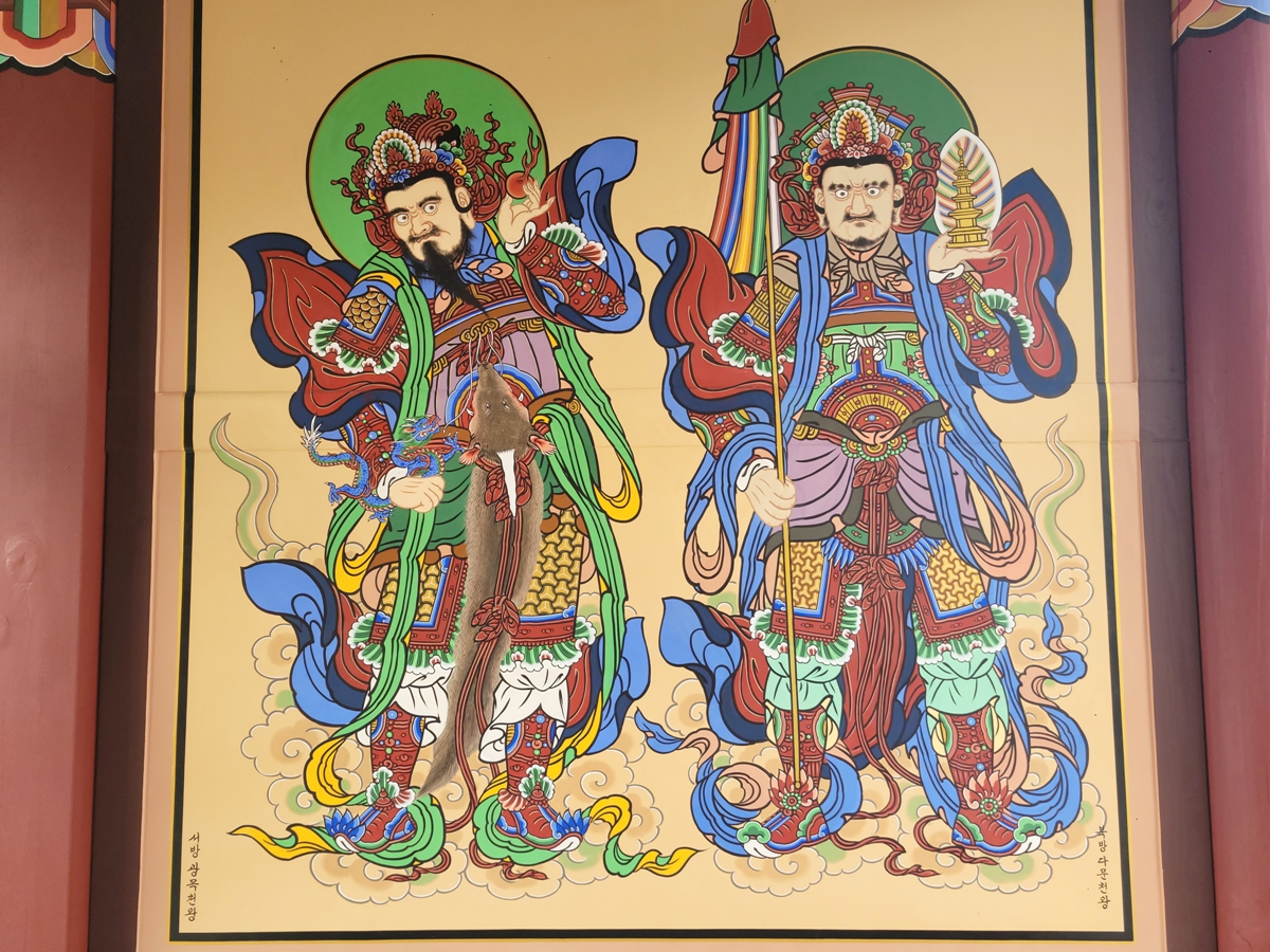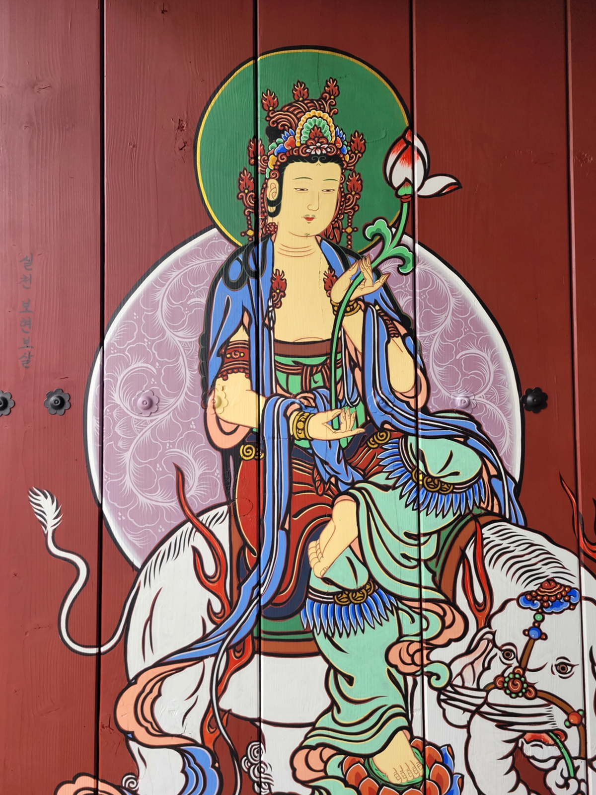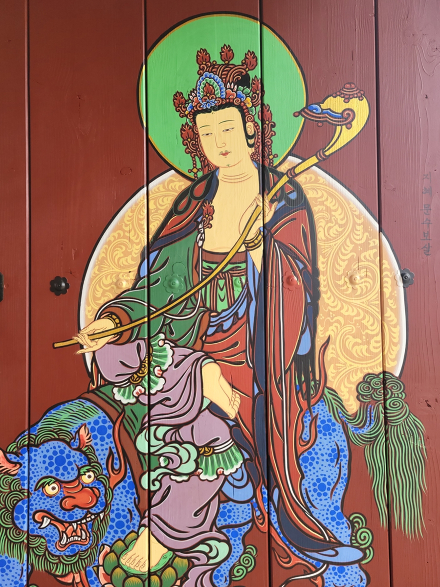 출입문에 실천 보현보살과 지혜 문수보살이 있습니다. 그림 옆에 어떤 보살인지 쓰여 있어 일반인도 알 수 있습니다. 실천 보현보살은 흰 코끼리를 타고 연꽃을 들고 있습니다. 지혜 문수보살은 푸른 사자를 타고 지혜의 칼(또는 여의봉)을 들고 있습니다.