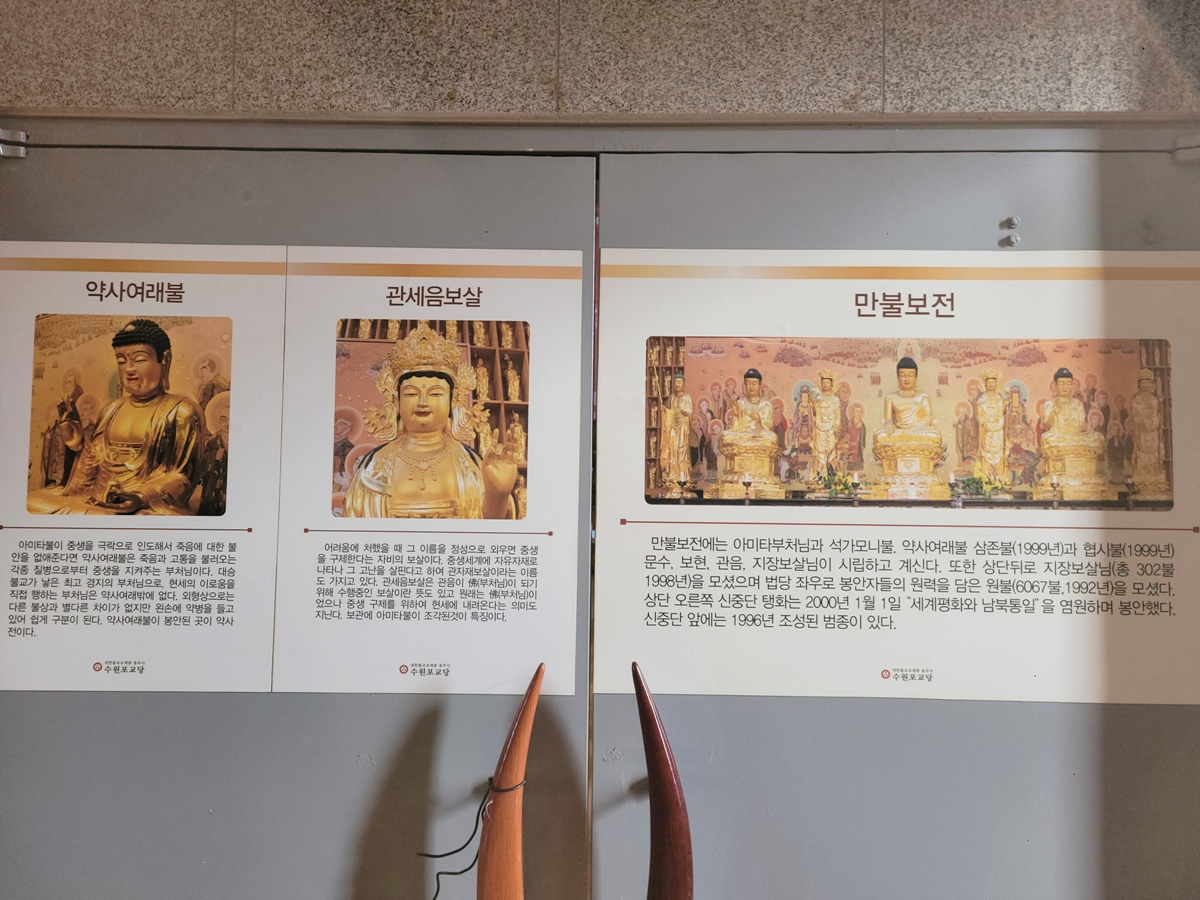 보통 사찰에 가면 부처님에 대한 설명이 없는데, 수원사는 안내판이 벽에 붙어 있습니다. 부처님 중 약사여래불, 관세음보살 등이 어떤 역할을 하는 부처님인지 불자가 아니더라도 쉽게 이해할 수 있도록 한 것이 특이합니다.