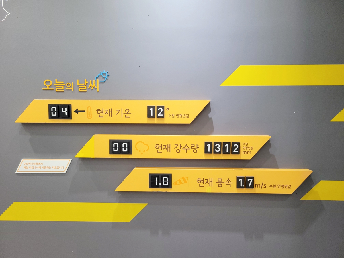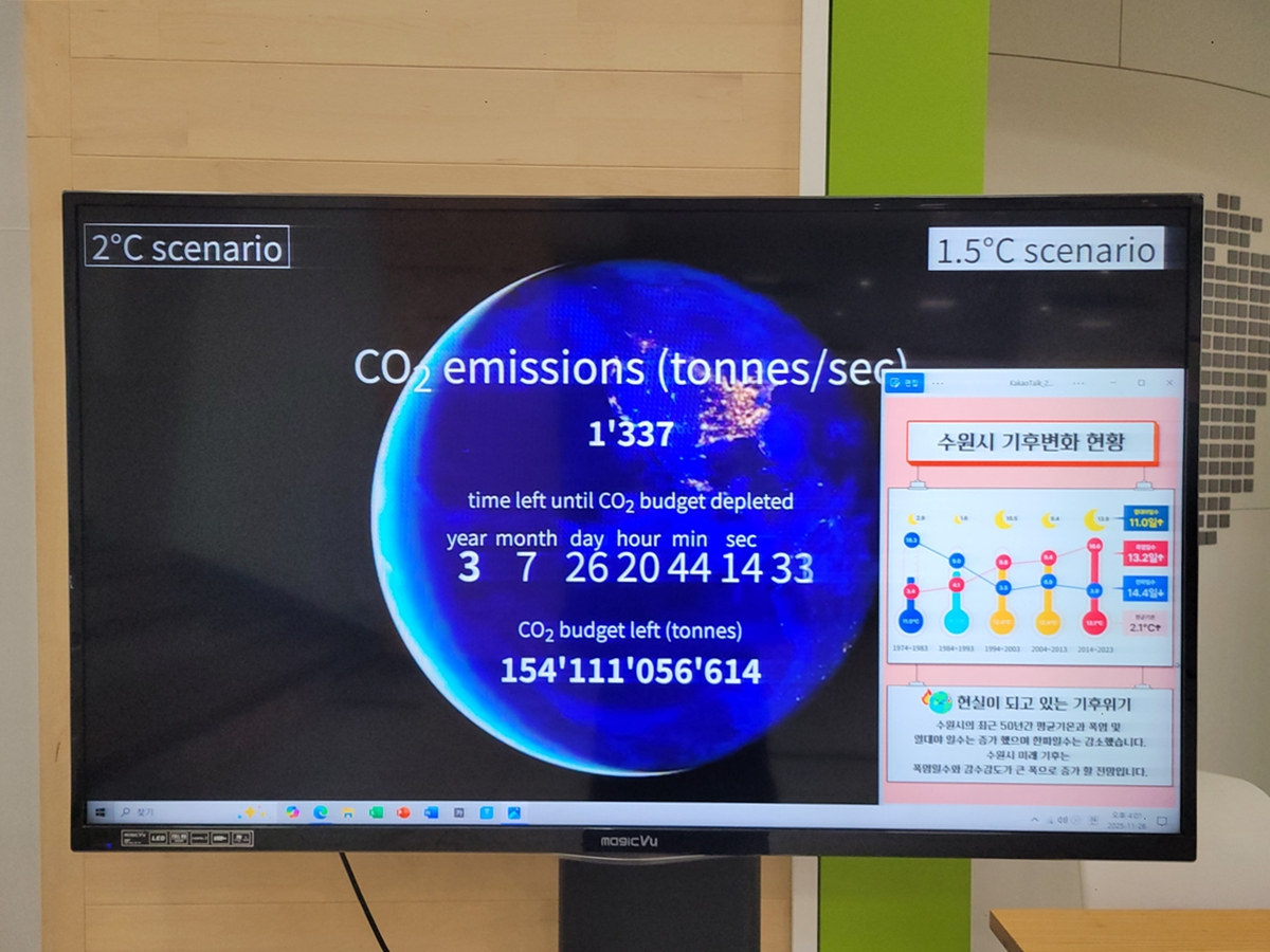 수원시가 겪고 있는 기후 변화의 구체적인 현황 데이터와 시의 대응 정책을 한눈에 볼 수 있는 전시 공간입니다. 내가 살고 있는 도시의 환경문제를 명확히 인식하고, 탄소중립 실천의 필요성을 지역 사회와 연결 지어 생각해 볼 수 있습니다. 기후위기 시계를 보니 산업화 이전(1850~1900)보다 1.5°C 상승하는 시점까지 남은 시간이 3년 7개월 26일 20시간 정도 남았음을 알려주고 있습니다.