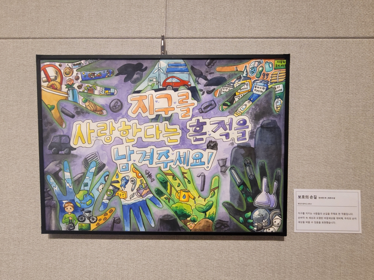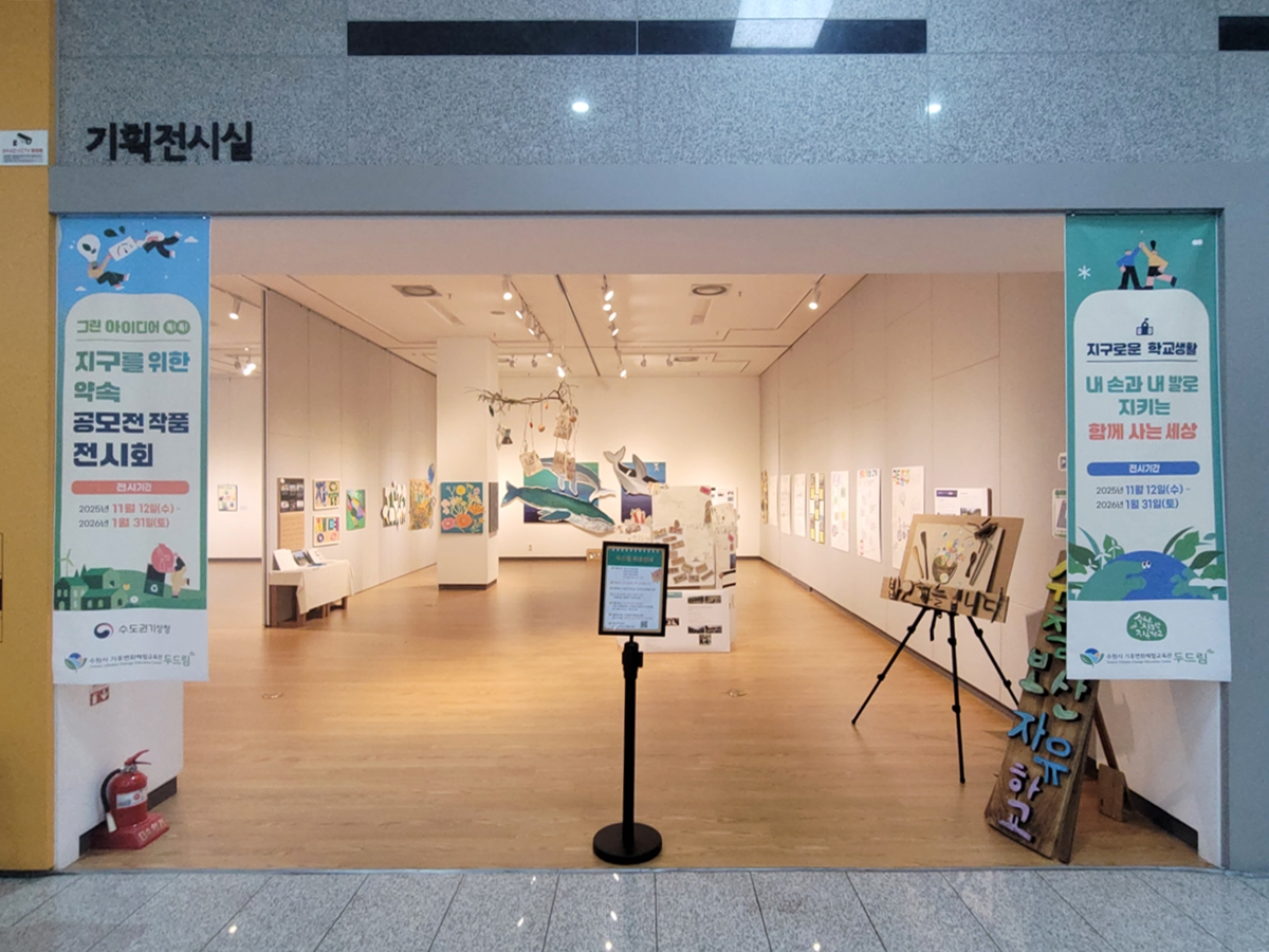 지구를 위한 약속 공모전 작품 전시회(2025.11.12.~2026.1.31.)는 시민들이 직접 참여하여 기후 행동을 약속하고 그림, 글, 사진 등으로 표현한 공모전 수상작들이 전시되어 있었습니다. 시민들의 따뜻한 마음과 실천 의지를 엿볼 수 있는 공간이었습니다.