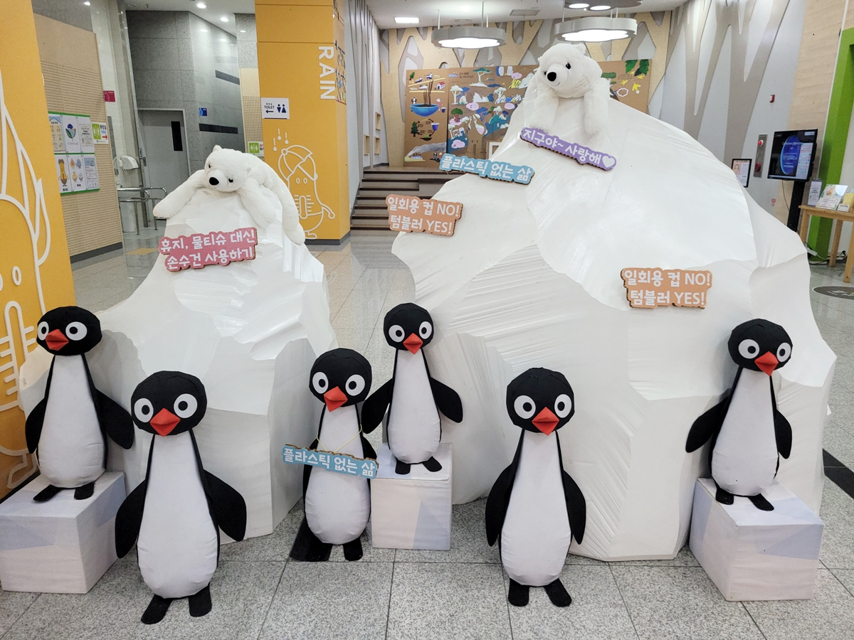 북극지방의 기후 위기를 상징적으로 보여주는 펭귄 포토존이 마련되어 있습니다. 귀여운 펭귄 모형 앞에서 기념사진을 찍으며, 동시에 일회용 컵 사용 금지 등 우리가 지켜야 할 아름다운 자연과 기후 난민이 될 수 있는 환경문제를 배울 수 있습니다.