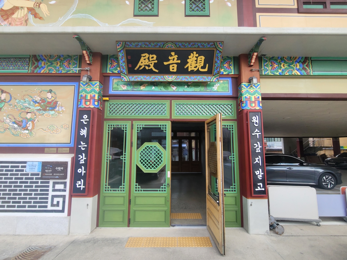 신도휴게실 맞은 편에 관음전이 있습니다. 관음전 출입구 좌우에 “원수 갚지 말고 은혜는 갚아라”라는 말이 가슴에 와닿네요. 수원사는 도심에 있어 시민들에게 불교문화 체험 기회를 적극적으로 제공하고 있습니다.